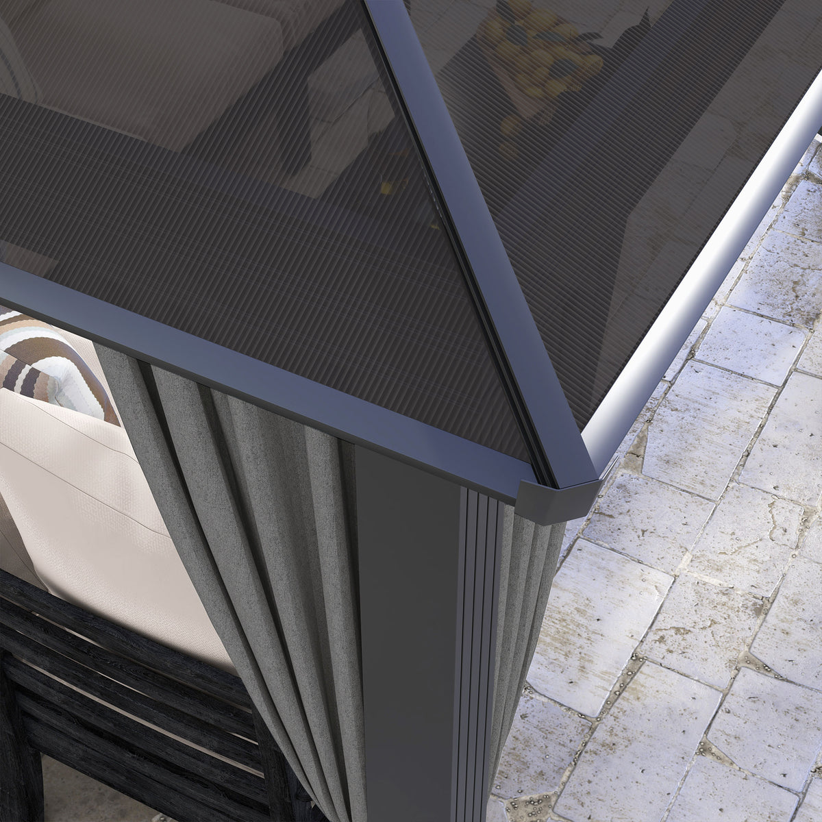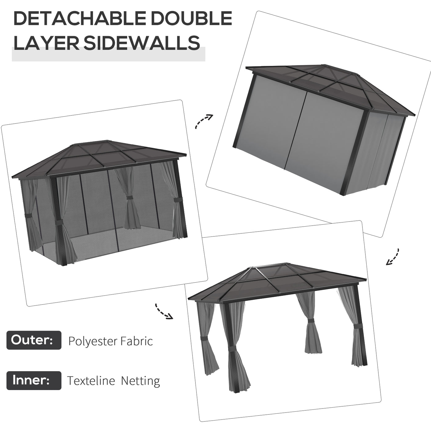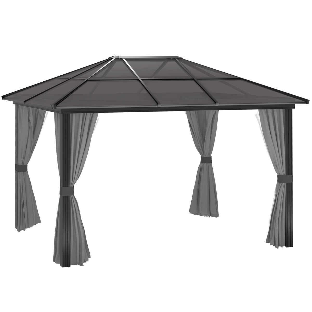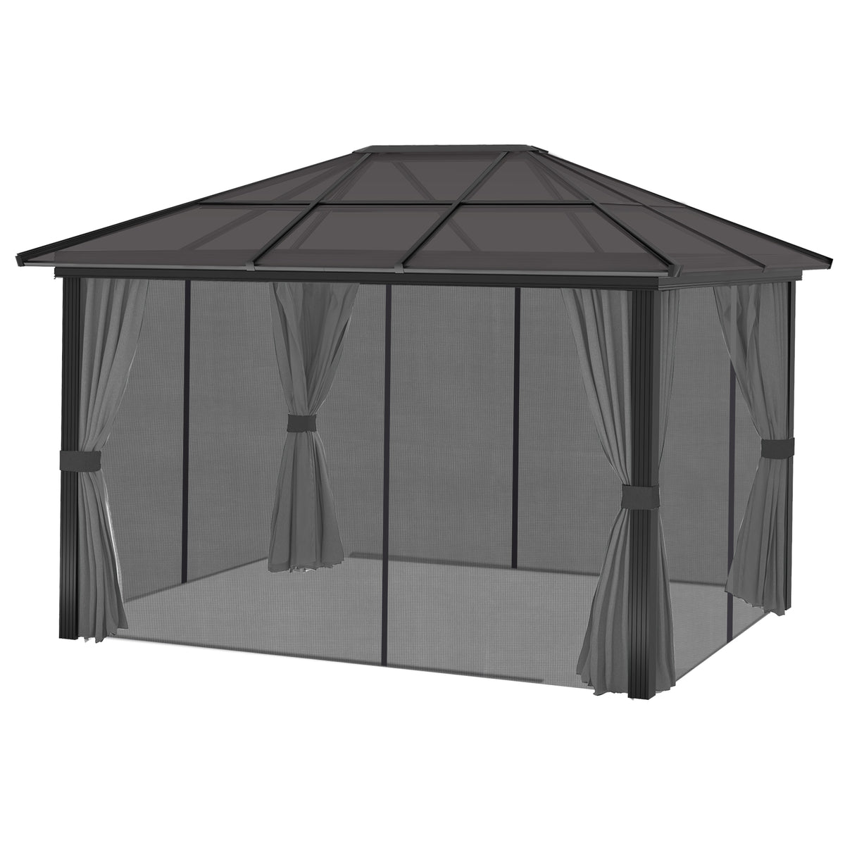 Outsunny 3 x 4m Hard Top Gazebo Garden Pavilion with Netting and Curtains, Polycarbonate Roof and Aluminium Frame - Dark Grey