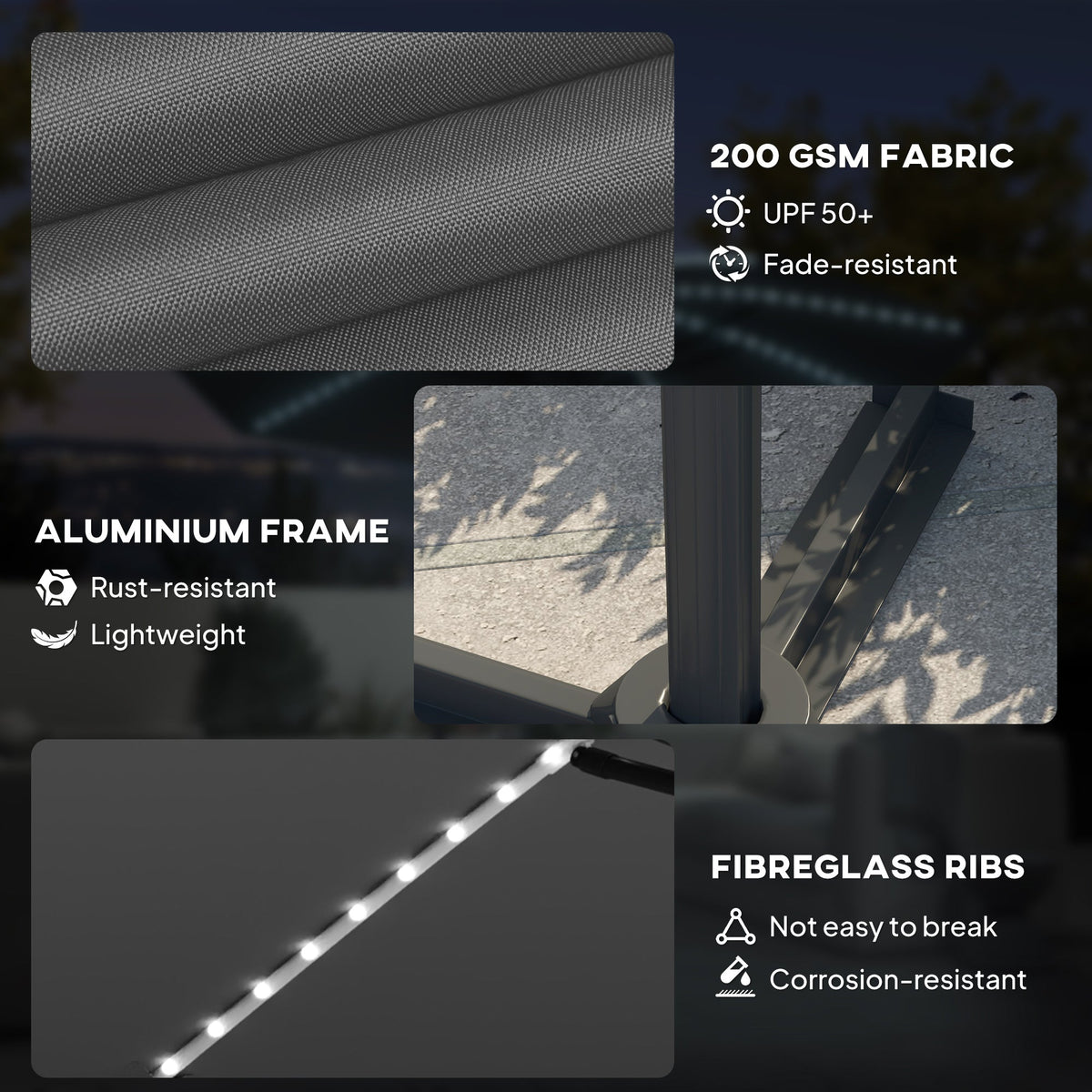 Outsunny 3(m) Cantilever Garden Parasol with Solar Powered Lights, Crank Handle & Cross Base, UPF 50+, 360° Rotation, Dark Grey - Dark Grey