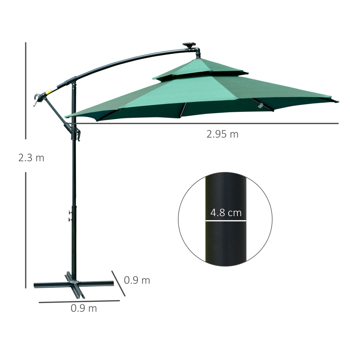 There's no better way to prolong the evenings this season: say hello to this Outsunny cantilever parasol with lights. The large overhanging design creates shade, without the pole getting in your way. It's fitted with solar-powered LED lights on the ribs, which charge in the day to illuminate at night - no electricity required. Use the crank handle to open/close the canopy easily, and adjust to a position you want. Cross base included - use Outsunny weights to complete.