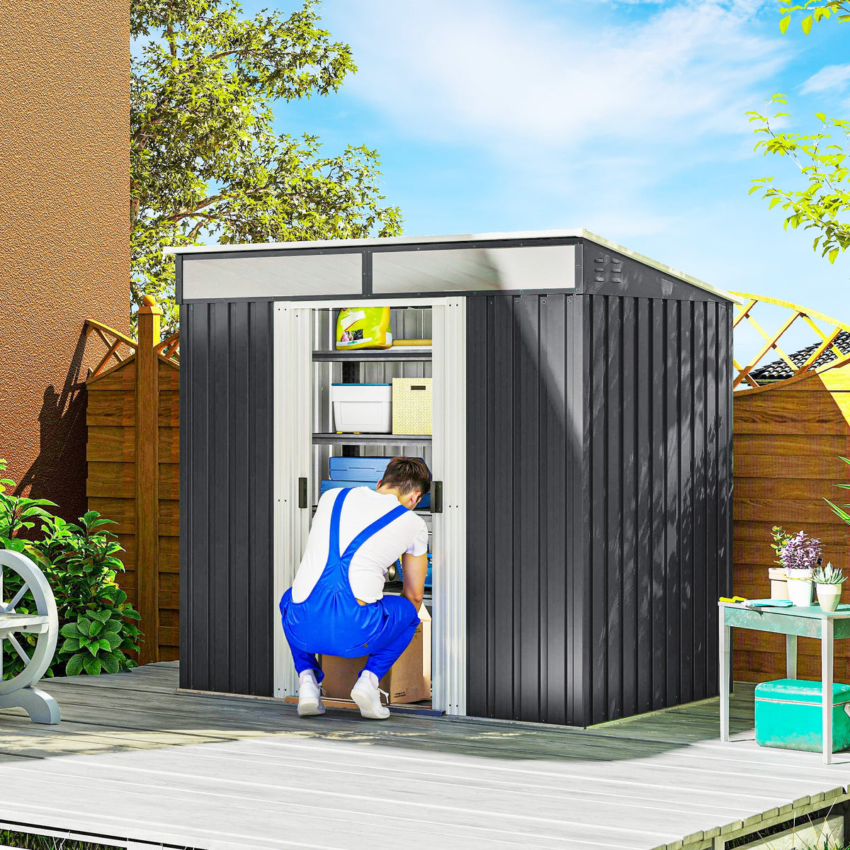 Keep garden equipment safely stored, in a place of their own with this Outsunny 6.5 x 4ft metal shed. Made from galvanised steel, the structure is strong and tough, suitable for outdoor use. The open design inside means plenty of room for tools. It features two clear windows to allow natural light through in the day, with ventilation slots to bring fresh air inside. A sliding door for easy access, finished with a lock and key for security.