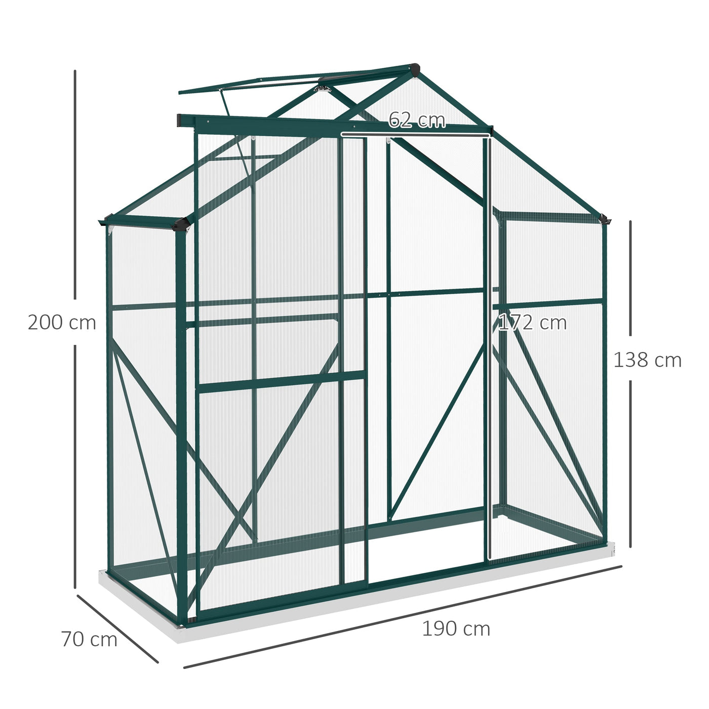The magic of gardening strikes again with this Outsunny greenhouse. The 70 x 200cm size is long and narrow - fitting in lots of vegetables and flowers. The powder coated aluminium frame means a strong core, with gutters built in for effective rainwater drainage. Twin polycarbonate walls create a safe growing space for plants; shields against rain and wind, whilst allowing 90% of nourishing sunlight to pass through. A sliding door for easy access, complete with a five-level top window.