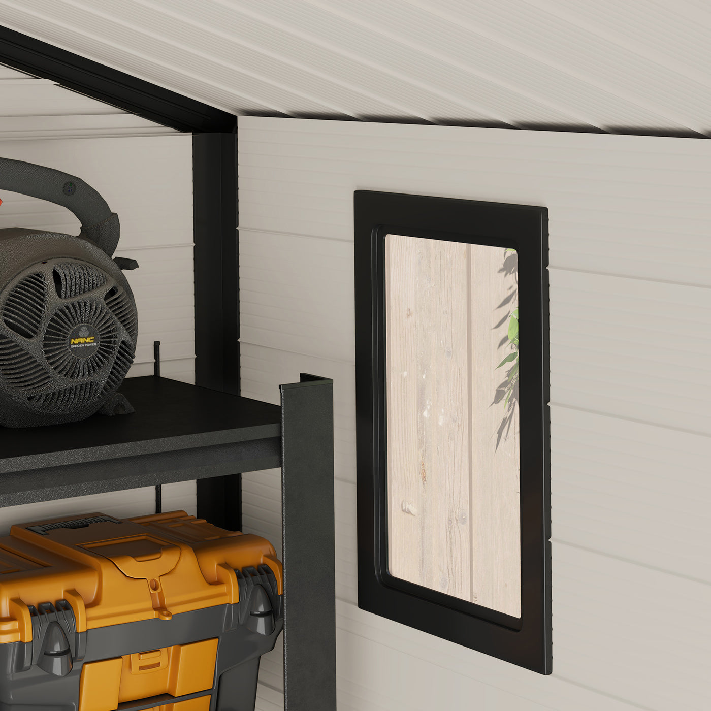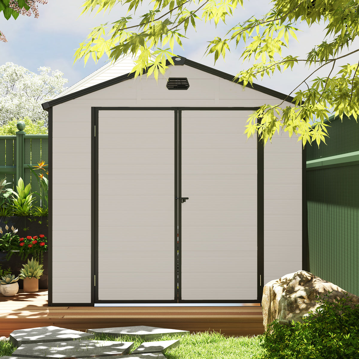 Secure your garden tools and outdoor essentials in the Outsunny 8 x 6ft garden tool shed, featuring a robust aluminium frame and lasting plastic walls designed for external use. This lockable garden shed ensures safety and includes two air vents and a window for ventilation and light. A foundation is provided for stable positioning.