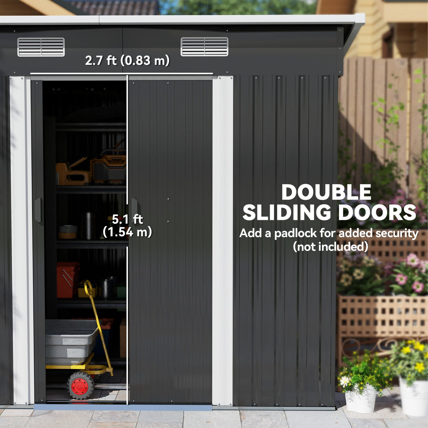 This Outsunny outdoor shed is a safe and protective way for keeping tools, equipment and outerwear stored. It's also spacious enough as a bike storage shed too - great for the outdoor adventurers. Made from corrugated steel, it's strong, fitted with a sloped shed to prevent rainwater building up. Two front vents keep the inside as fresh as possible. A sliding door for easy access, shed comes complete with a foundation kit.