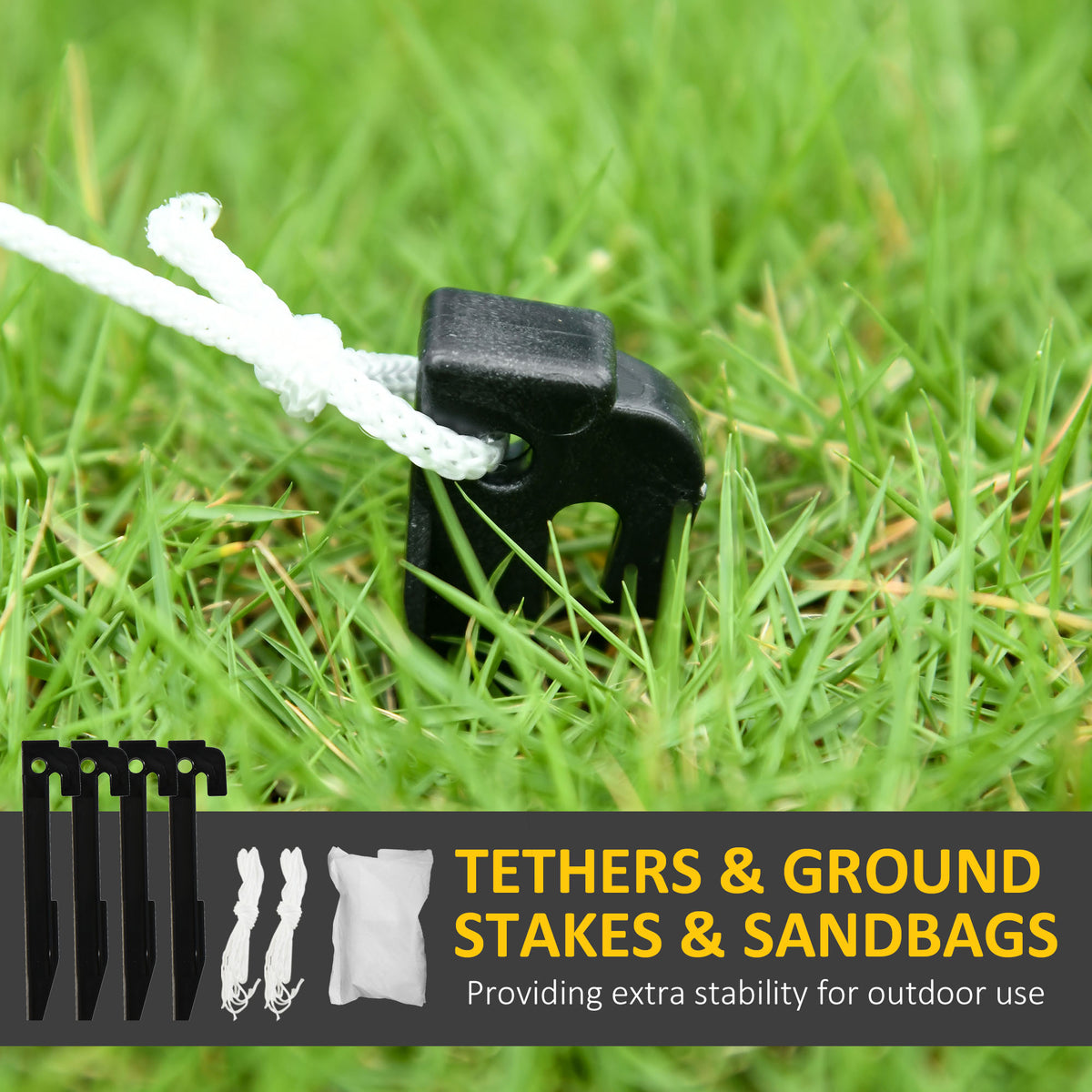 - Four ground stakes, two guy ropes and two sandbags included to pin and stabilise to the ground