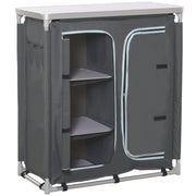 Ready when you are, this camping cooking table from Outsunny is a must for your camping trips, outdoor gatherings, and more. Made from aluminium, the outdoor kitchen unit's frame is lightweight and tough for reliable repeated use. The fabric coat covering the frame is water-resistant and features a door to shield inside. Three shelves on the left are great for organising, the right side area offers storage for larger items. Comes complete with the bag for easy carrying.