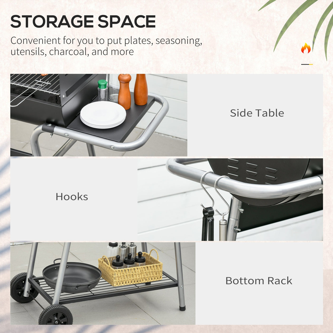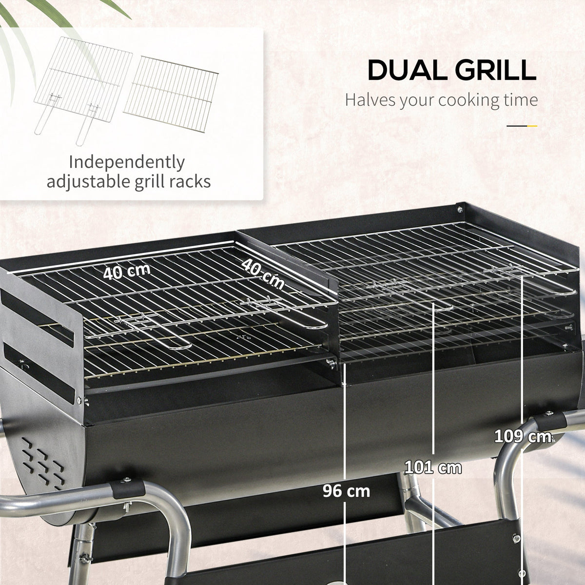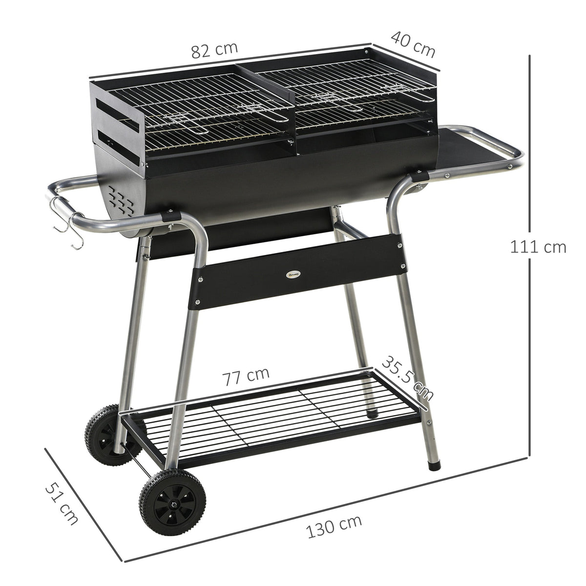 Outsunny Charcoal Barbecue Grill BBQ Trolley with Double Grill, Adjustable Grill Height, Side Table, Storage Shelf, and Wheels for Outdoor Cooking, 130 x 51 x 111cm, Black - Black