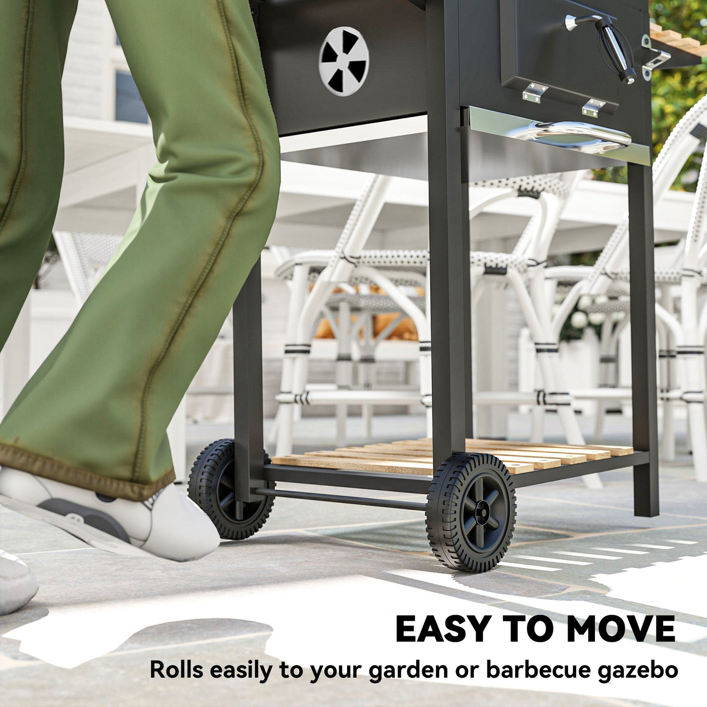 Outsunny Charcoal BBQ Grill with Height Adjustable Charcoal Pan, Barbecue Smoker with Warming Rack, 3 Shelves, Temperature Gauge, Wheels, Bottle Opener for Outdoor Cooking Garden Party - Black
