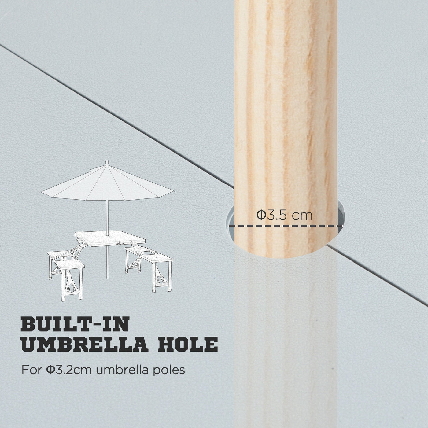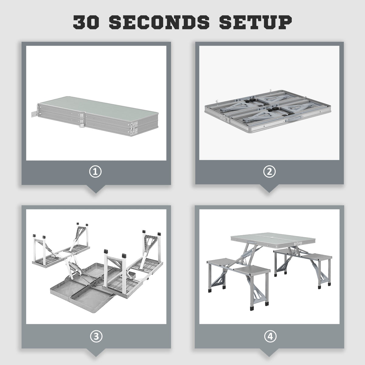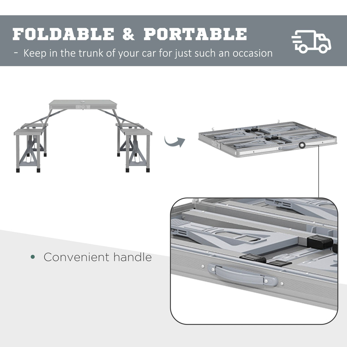 Looking for a convenient table and chairs for outdoor adventures? Check out Outsunny's folding camping table with four built-in seats, designed like a foldable suitcase. Lightweight and easy to transport, it's suitable for camping, beach outings, picnics and more. Crafted from aluminium, this bivvy table set combines lightness with stability.