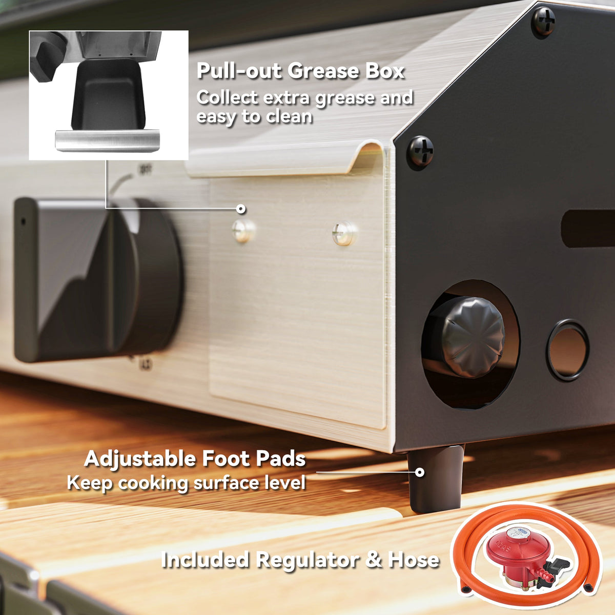 Cook up delicious food, wherever, with this Outsunny portable gas grill. It comes with four adjustable 2.4kW burners: cook different foods at different temperatures - makes it easier to cook a complete meal at the same time. Complete with a pull-out grease collection box for easier cleaning.