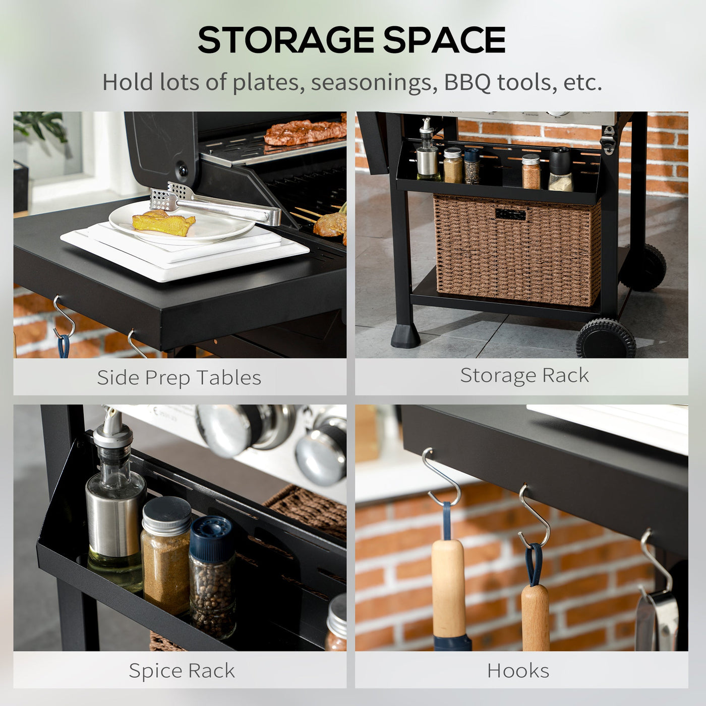 - Weight Capacity: (grill grate) 10kg, (bottom shelf) 20kg, (side table) 5kg