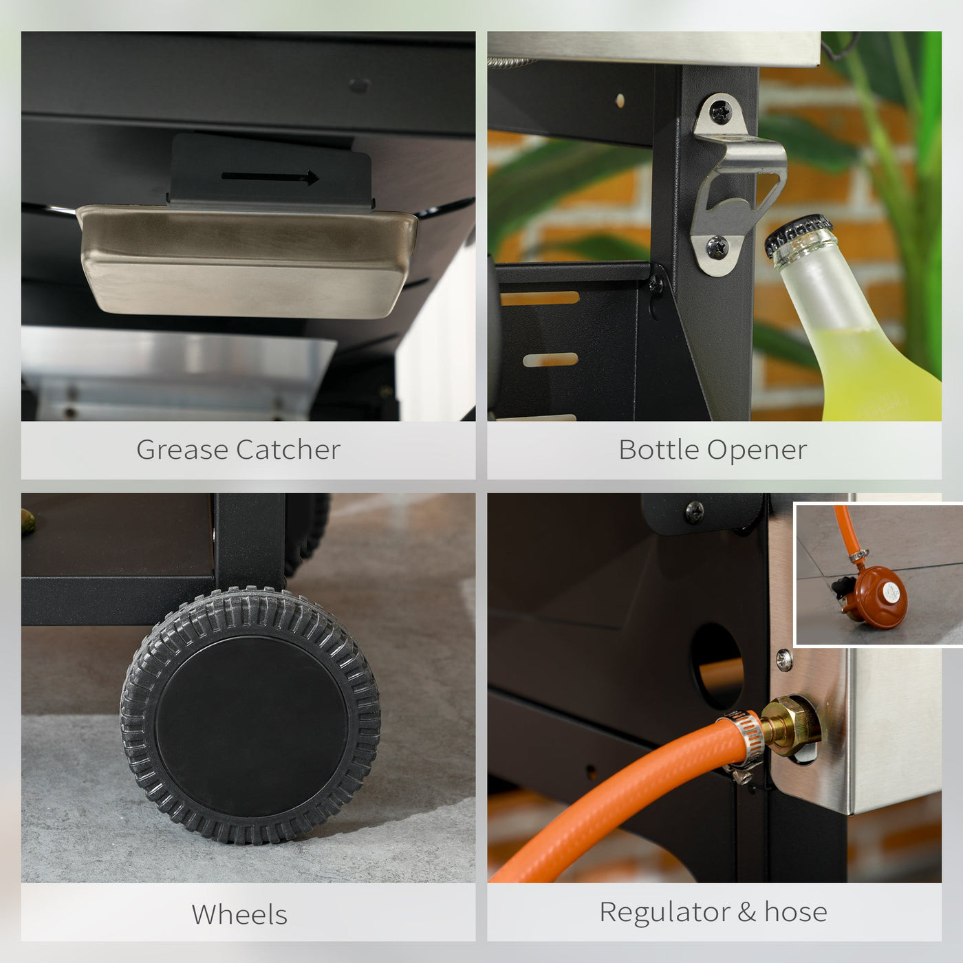Get friends together and delicious BBQ food with this Outsunny grill. It features four independent burners, controlled by piezo ignition for easy, separate operation. The large 2282cm² grilling area is enough for 5-10 people party. Cleanup is hassle-free with the grease catcher, with the built-in bottle opener for beers. Have freshly cooked food at your fingertips, whenever.