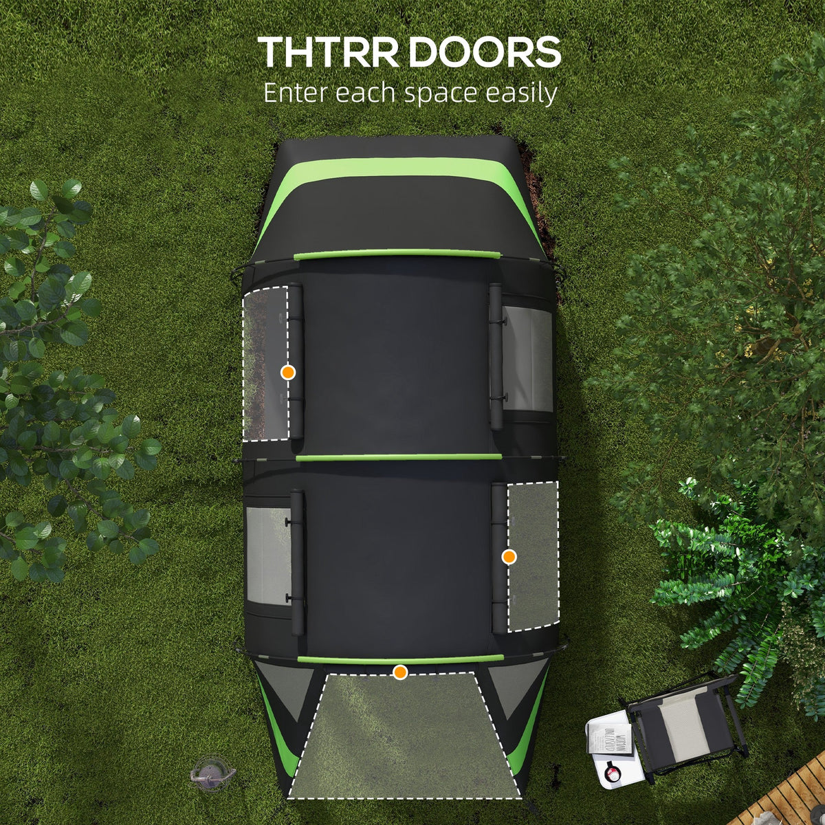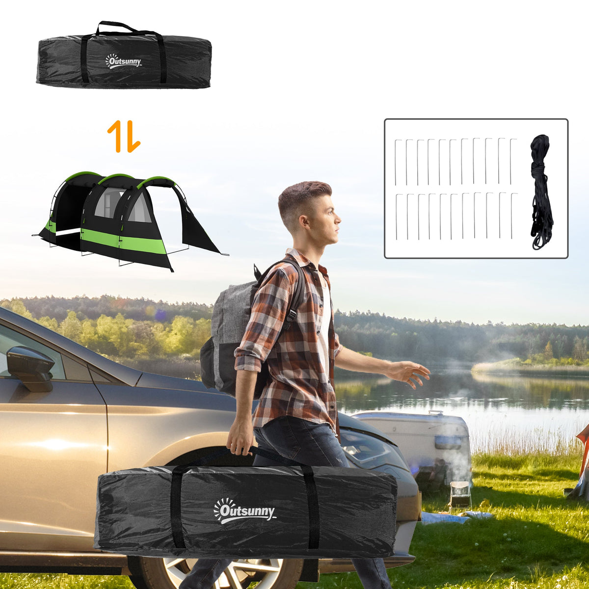 Share the fun of your camping with company. This Outsunny four man camping tent comes with a bedroom and living room. Fibreglass poles mean a tough and resilient core, so this large tent stays in shape. The waterproof tent protecting up to 3,000mm of rainwater. Doors to enter each space easily. This tunnel tent includes 22 x ground stakes, 12 x guy ropes and a carry bag.
