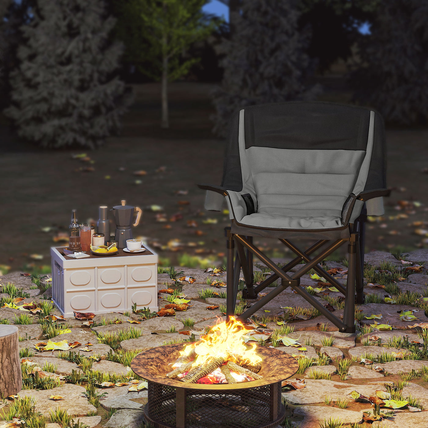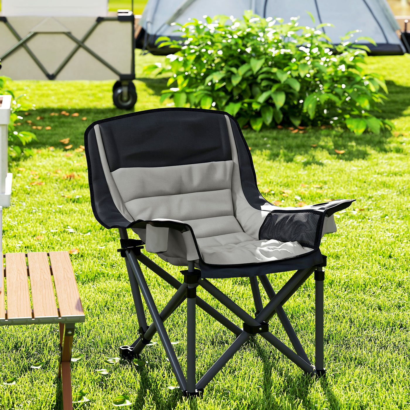 This Outsunny camping chair gives comfort to outdoor times, wherever you go. With the high density padding in the head, back, arms and seat, you'll sink in comfortably. A metal frame for a strong, supportive core, with the splash-resistant fabric seat for durability. Complete with two cup holders and side pockets. When done, all you need to do is fold it up and fit inside the included carry bag.