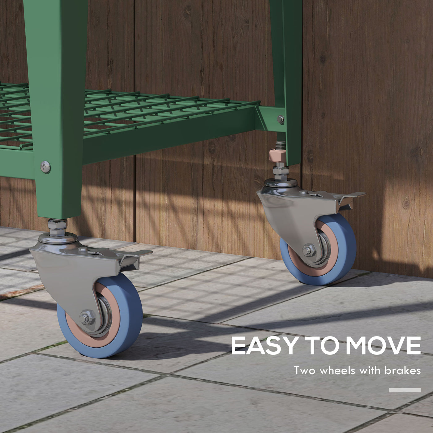 This Outsunny raised planter offers a place for many plants, vegetables and others. A steel raised planter, fitted with a plastic cover for a safe shield. Features a bottom shelf for handy holding room. The bed liner holds all soil together, with drainage hole to allow water to drain gently. Complete with two wheels with brake.