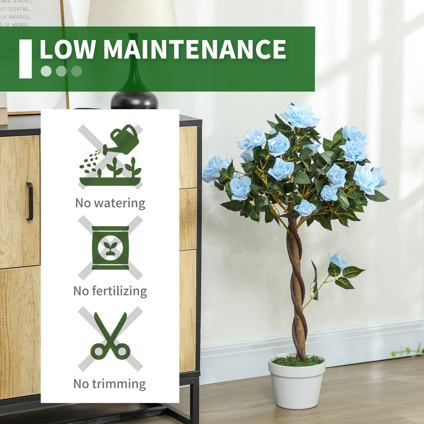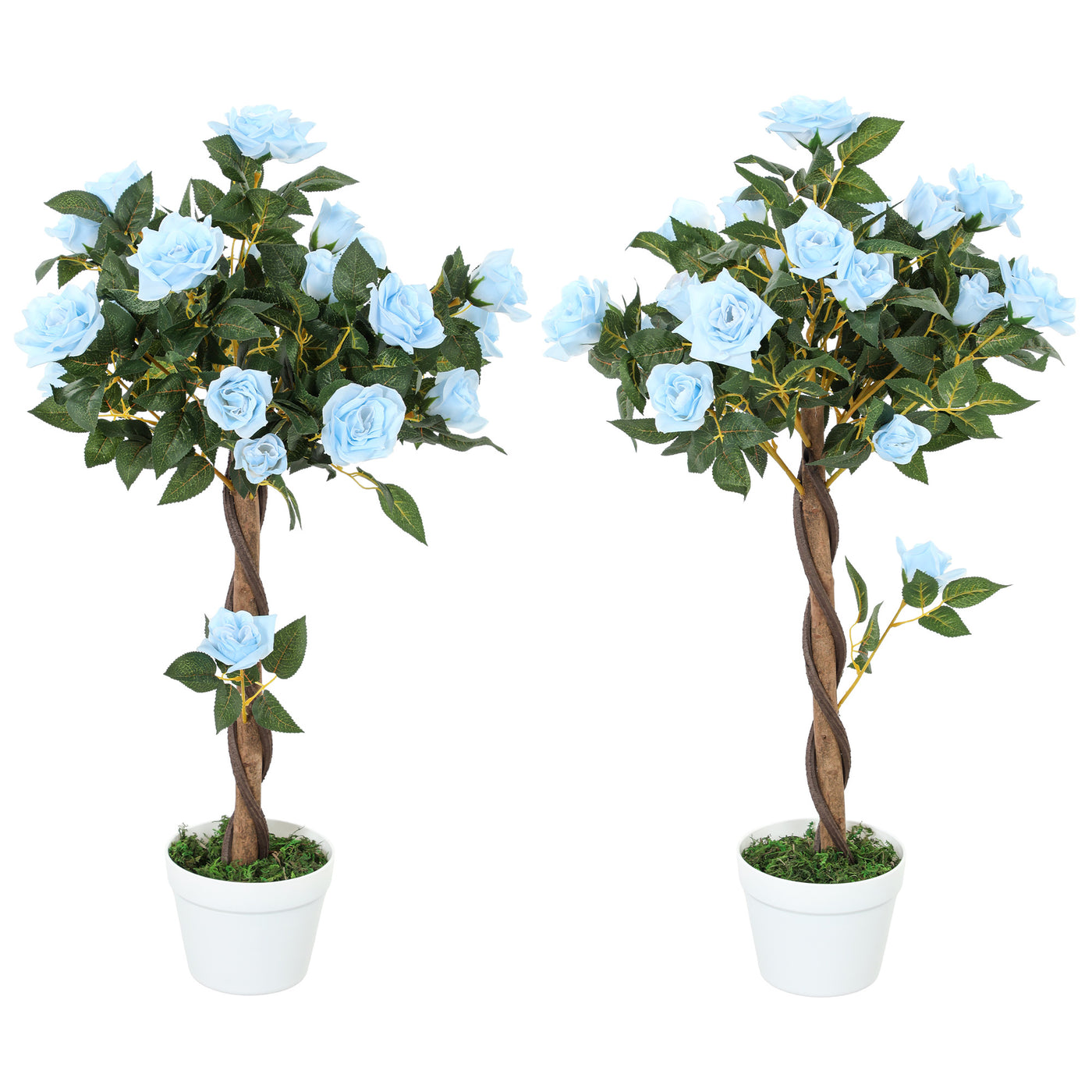 Outsunny Set of 2 Artificial Plants White Rose Floral in Pot, Fake Plants for Home Indoor Decor, 90cm, Light Blue