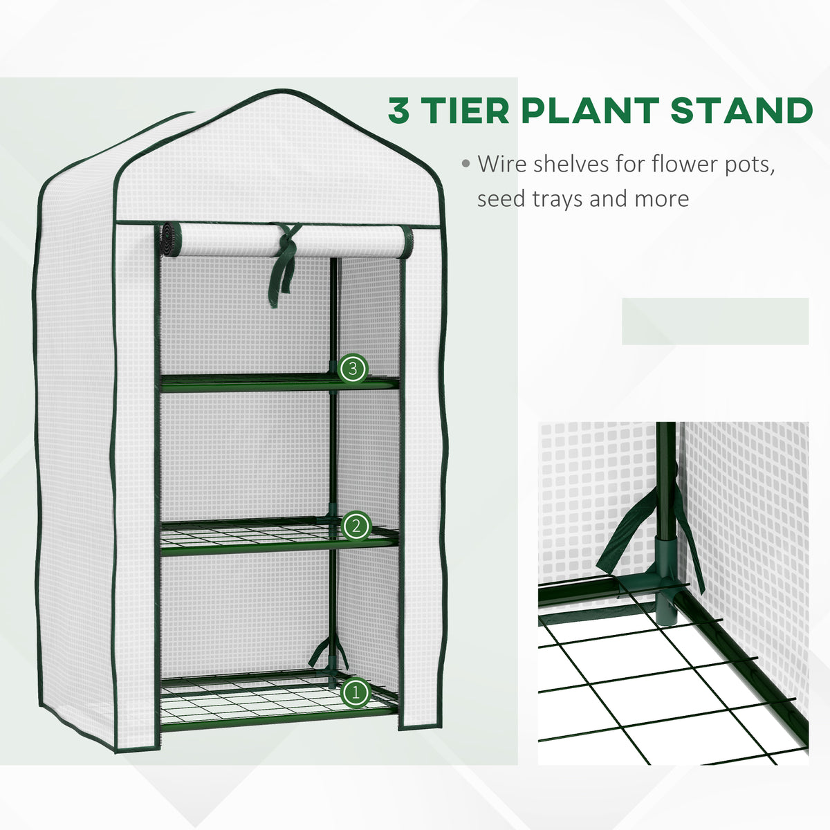 Grow plenty of plants, flowers and vegetables wherever you want, with this Outsunny mini greenhouse. With a steel frame for a strong core, it's formed into a three-tier design so you organise; the mesh shelves means there's no liquid build up so the frame doesn't become damaged. Fitted with a durable three-layer plastic cover to protect growing plants inside, complete with a roll up door to access inside. Use in the corner of your outdoors spaces - even windowsills!