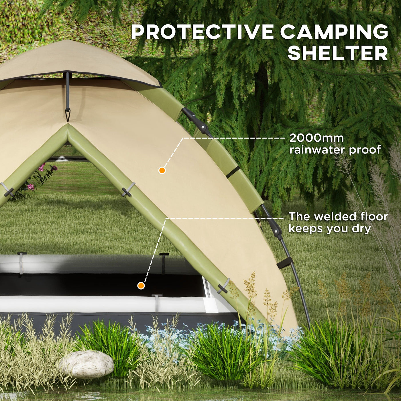 A safe home camping trips, thanks to this Outsunny three-man instant tent. The fabric shell offers 2000mm rain protection, with a top removable rainfly which shields the top from extra water. Two mesh windows bring fresh air inside. Tent comes with 10x ground stakes, 4x guy ropes and carry bag - everything you need in one set.