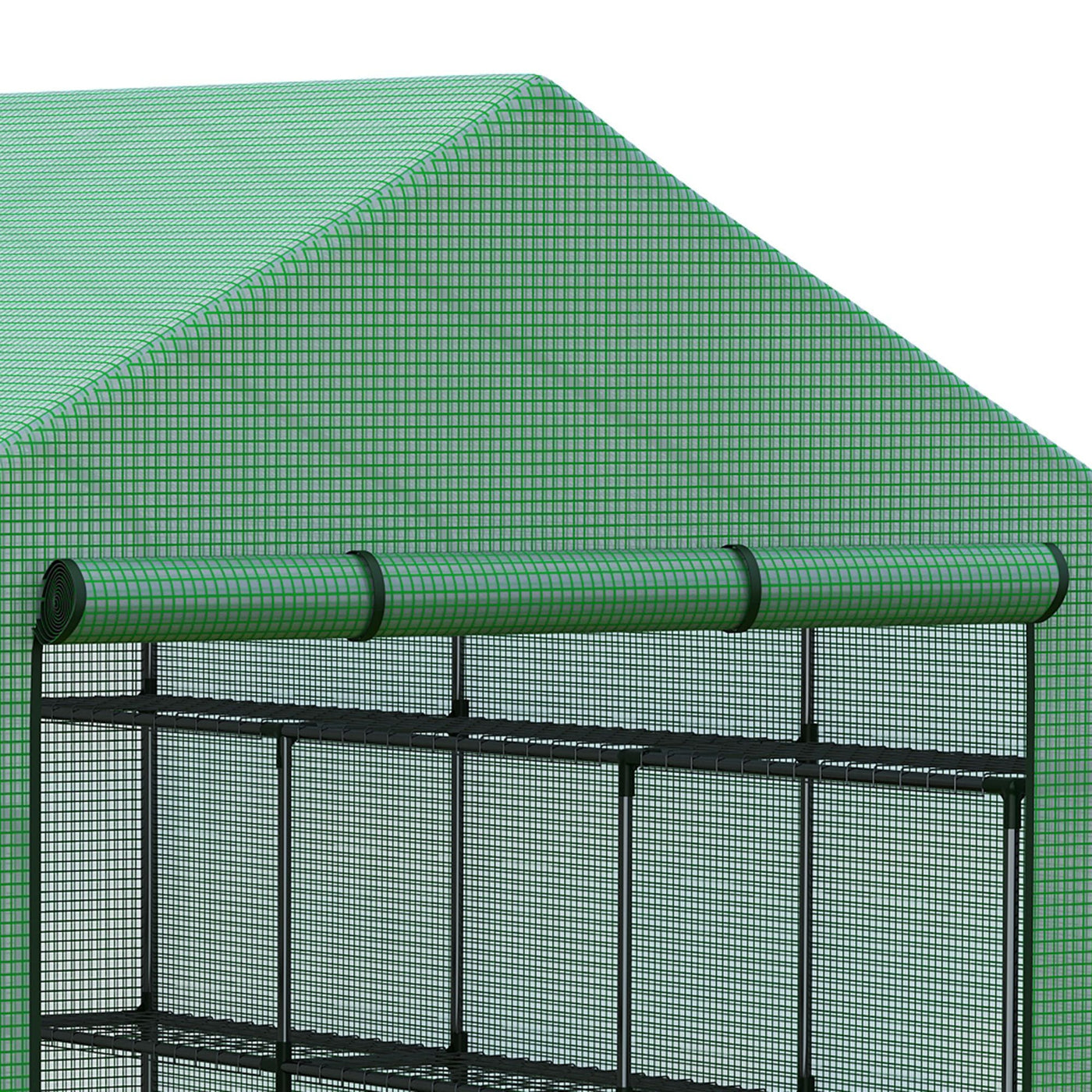 Green growing outdoors, all year round with this Outsunny 8 x 6 ft walk-in greenhouse. A spacious garden greenhouse which houses plenty, it also comes with 12 shelves to allow you to easily organise pots and more. A powder coated steel frame for a strong core, fitted with a plastic cover to keep inside protected from outer weather, finished with a roll-up door for easy access.