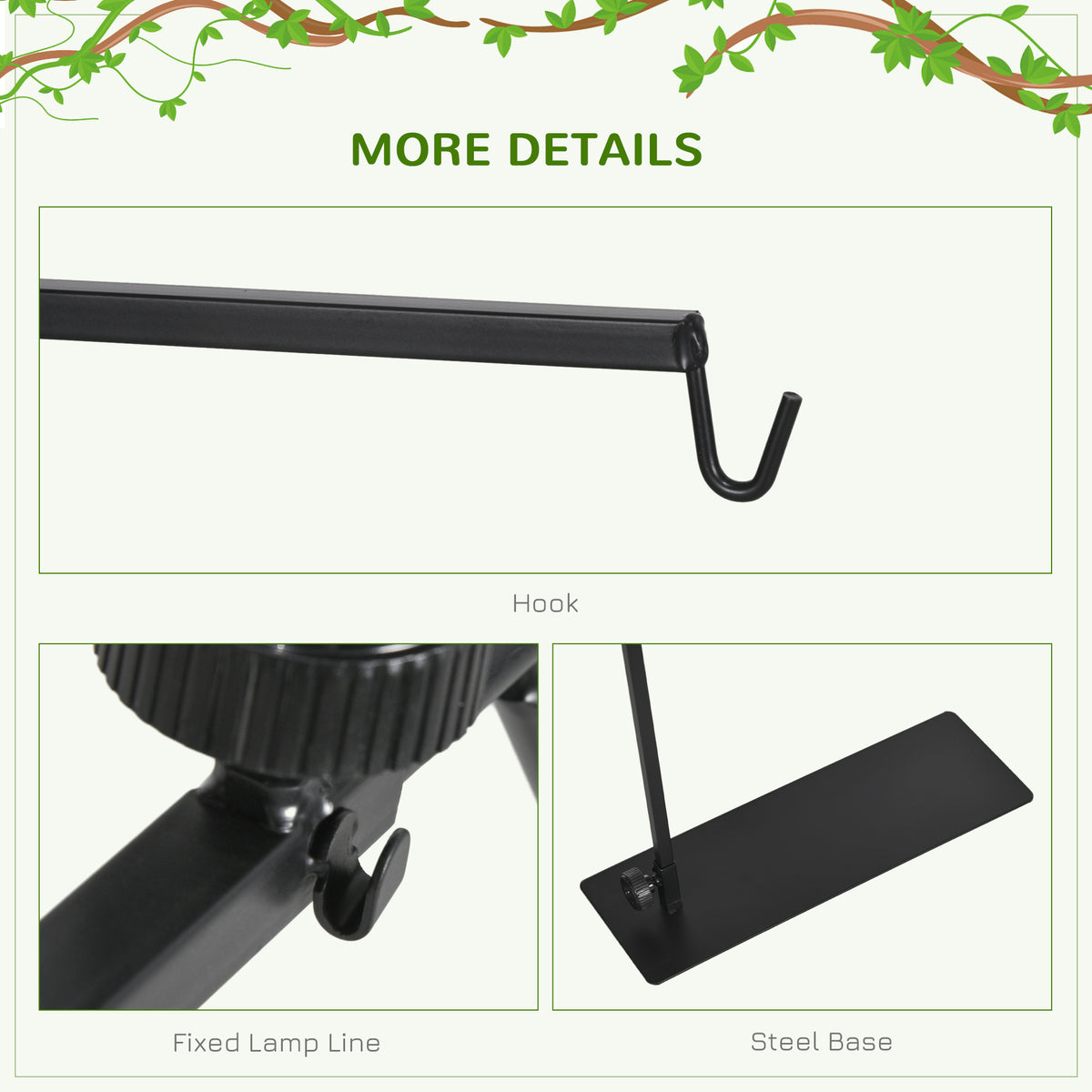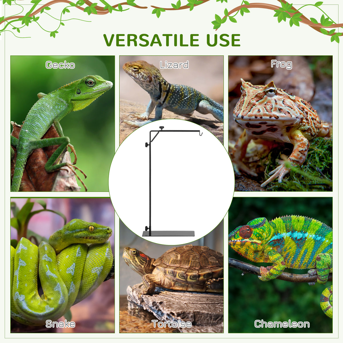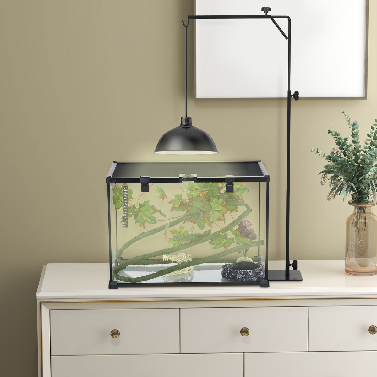 PawHut 86-129Hcm Adjustable Height and Length Reptile Lamp Stand Holder with Hook Hanging, Base - Black - Black