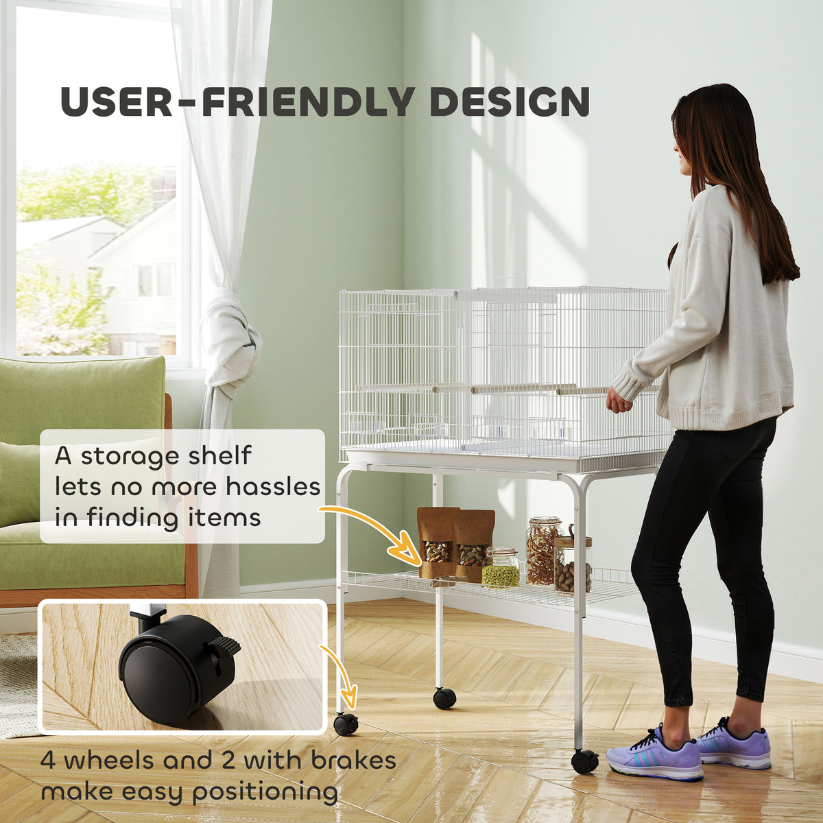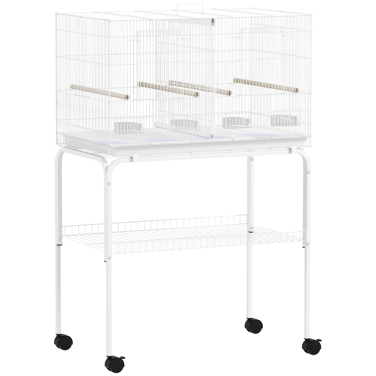 PawHut Bird Cage with Divider, 4 Wooden Perches, Slide Out Tray, 4 Feeders, for Budgie, Lovebird, Canary, 76 x 46 x 116cm White - White