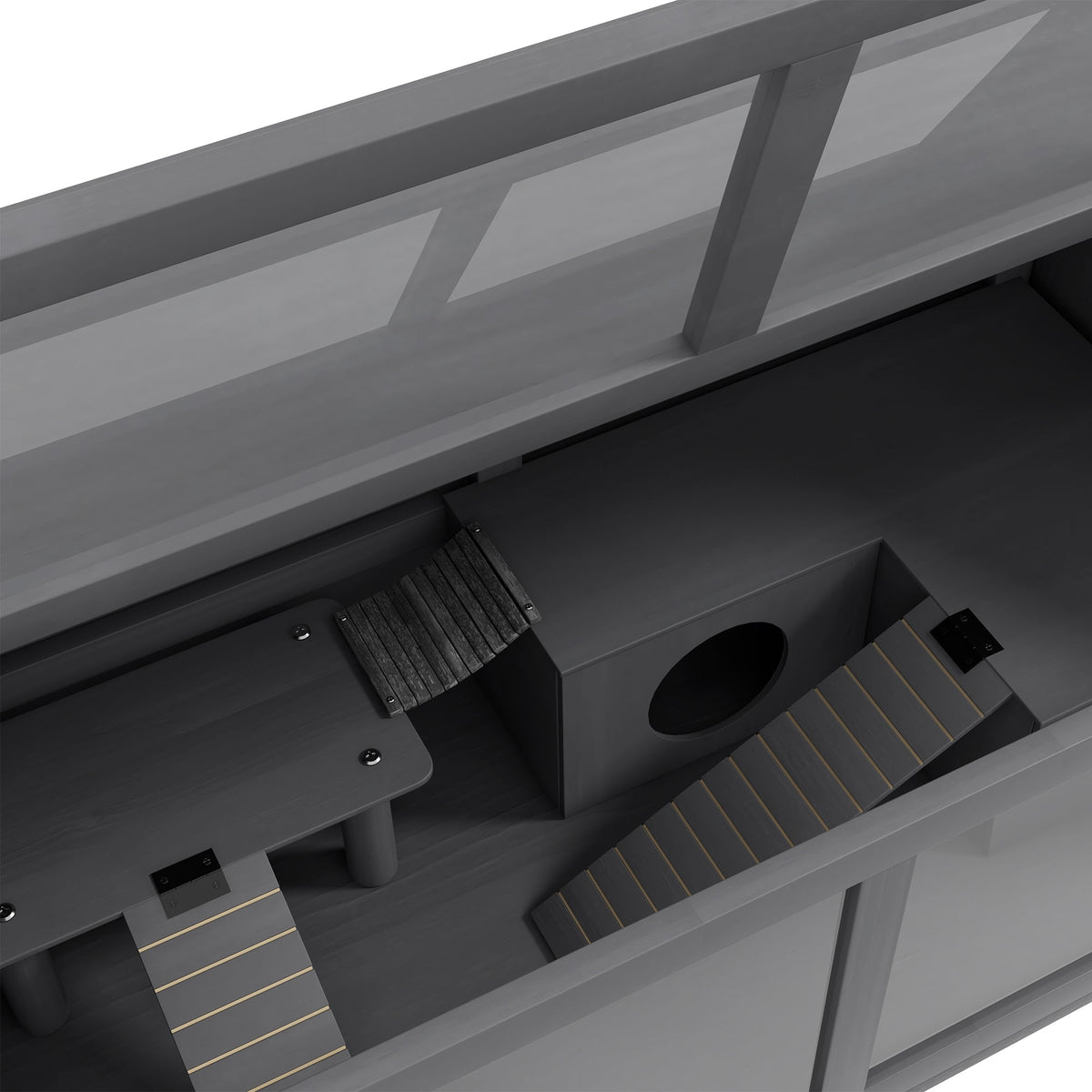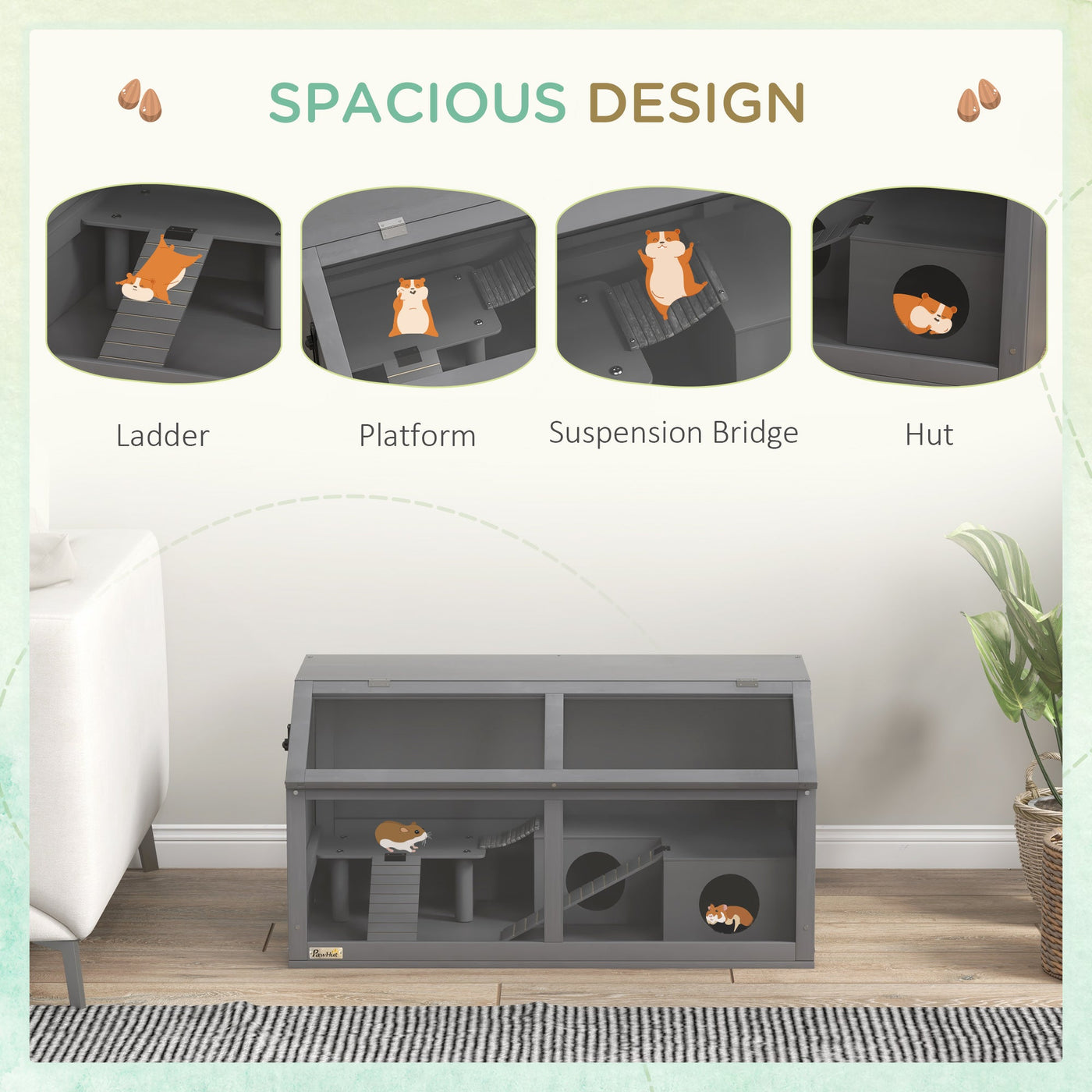 PawHut Hamster Cage, Wooden Small Animal Cage for Gerbils, Mice w/ Suspension Bridge, Openable Top, Hut, 85 x 45 x 44cm - Grey - Charcoal grey