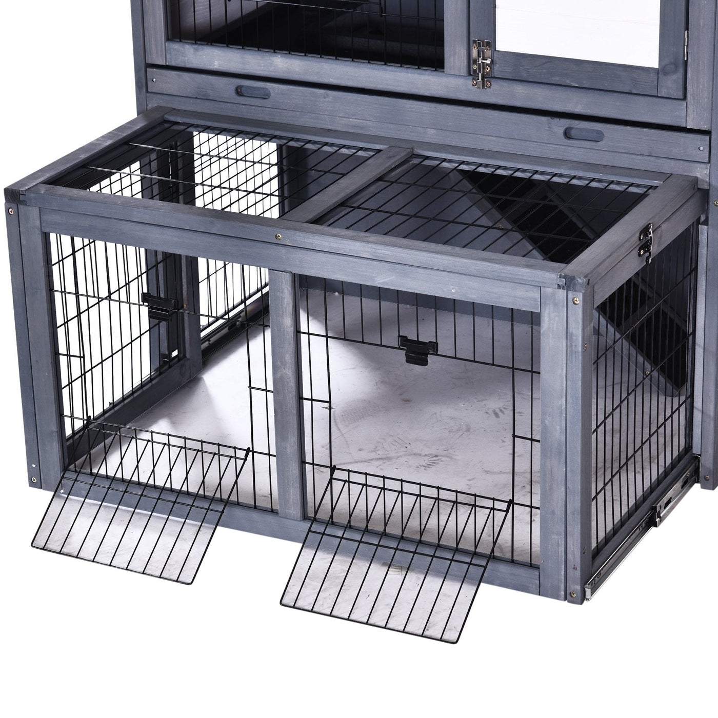 Give your beloved rabbit a safe and comfortable place to call home with this rabbit hutch from PawHut. Made from fir wood strength. with a weather-resistant paint coating for protection outdoors, this piece is crafted into a two-part design, consisting of a house and an outdoor area. A main room is situated at the top of the house, with the bottom featuring a ramp which connects to the outdoor area – a medium-sized space that gives the freedom of fresh air but with metal wire caging to keep them protected. Multiple doors and a pull-out tray ensure easy access to get your rabbit and clean the hutch, whilst the openable sloped roof with asphalt protects the interior from mild water damage.