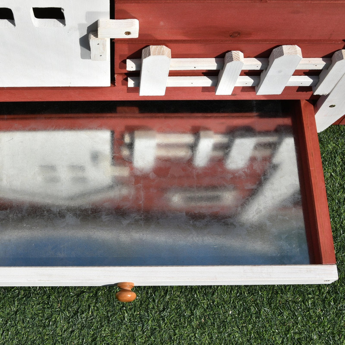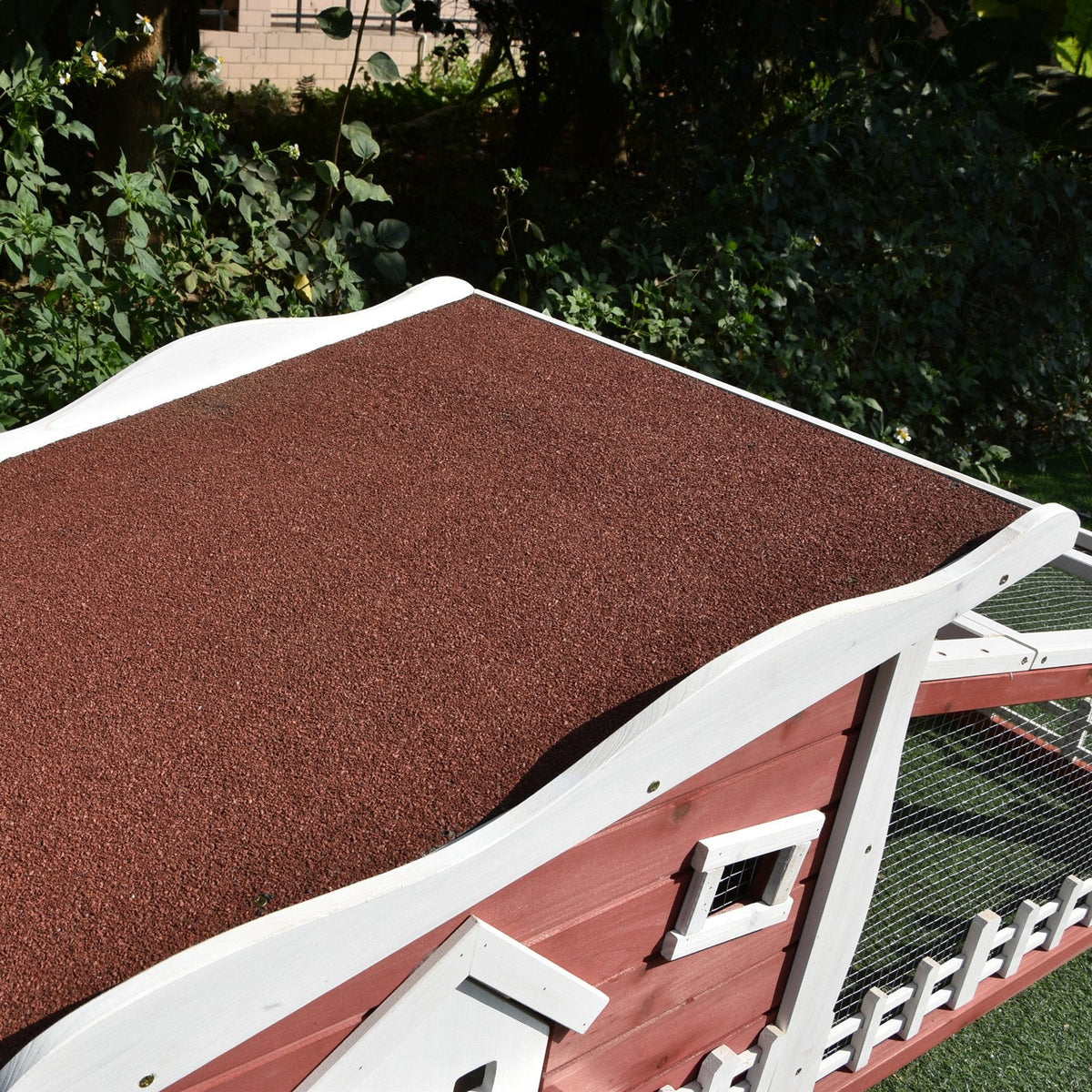 Give your furry friends an ideal mix of freedom and security with this outdoor rabbit cage from PawHut. This habitat with run space is suitable for rabbits, guinea pigs, and other small animals and is crafted from solid fir wood for superior strength and durability. An easy to access ramp which can also be a small door connects the living house and run space together. The rabbit hutch has a unique design which features a lovely door and window on the front and wooden playpen for rustic and lovely appearance. Wire mesh walls that allow for proper airflow and ventilation. Slide-out tray for easy feeding and clean up and the entire unit is water-resistant to protect the rabbit hutch from rainy and wet conditions.