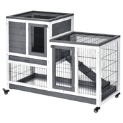 This indoor rabbit cage from PawHut is suitable for your rabbit, guinea pig and any other small animals you might own. The structure, made from fir wood for solid and sturdy wear, is crafted into a two-area design, consisting of the house area and the spacious bottom hutch, connected via a large ramp to give your pet plenty of room to move about. The wood is coated with a water-based paint which gives it extra protection. Two locking doors and two pull out trays allow easy access inside for cleaning and changing food, water and bedding. It's finished with steel wire around the run to keep them enclosed and four wheels to move around easily.
