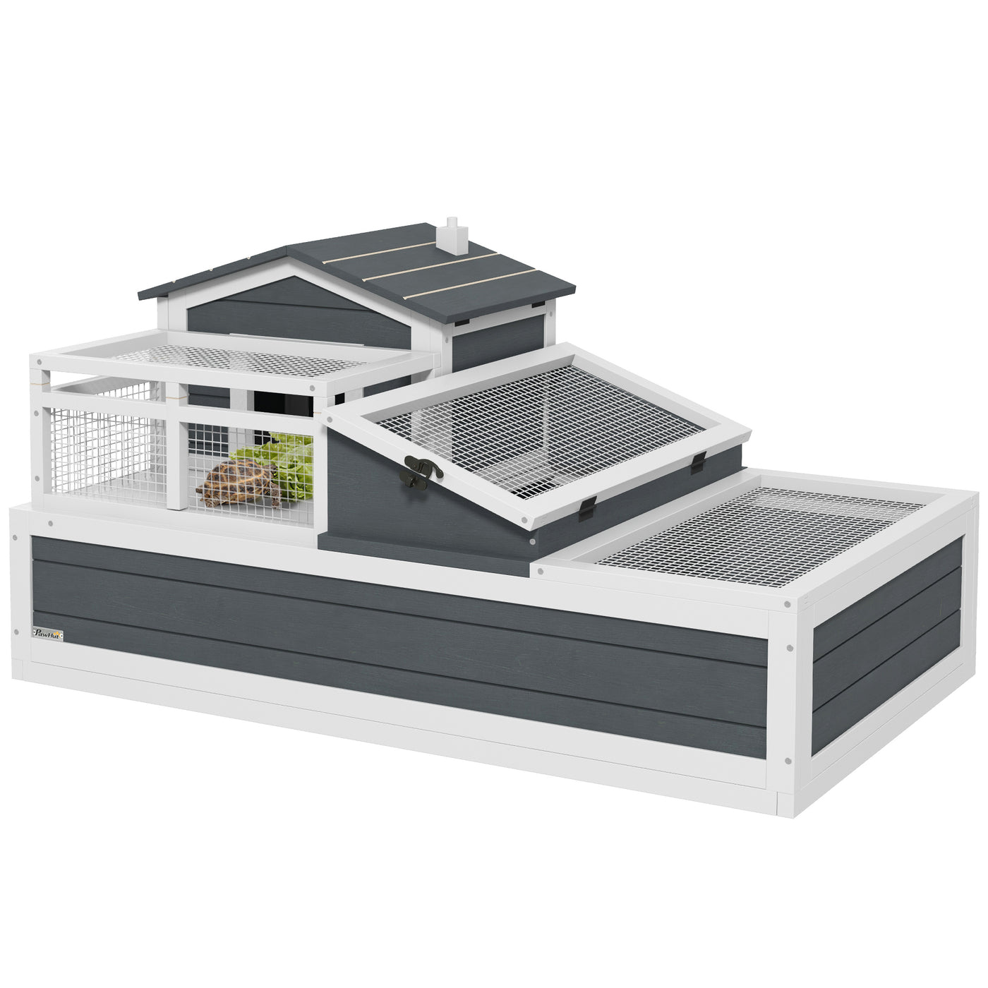 PawHut Tortoise House 3-Room with 2 Stories, Ladder, Balcony, Tray, Openable Roof, 59H x 112L x 65Wcm, Grey - Grey