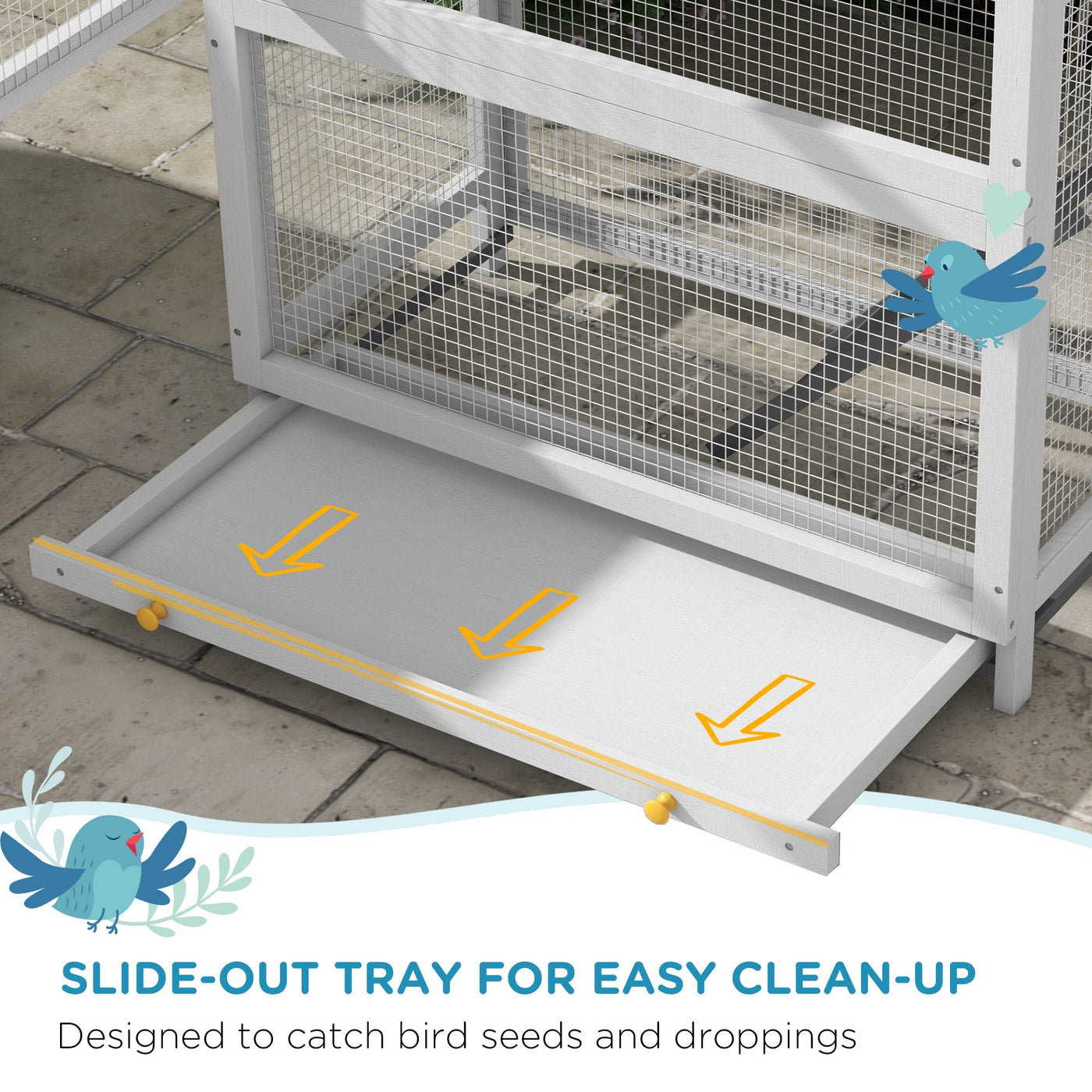 Treat your birds to a spacious and cosy PawHut bird cage. With plenty of room to spread their wings, they'll enjoy using the different stands and ladders, providing plenty of spaces to relax. There are multiple doors, so catering to your pets is effortless. They'll live in a tidy space, thanks to the removable tray making cleaning simple. Finished with a wooden construction, it's suitable for outdoor use. A comfy and secure home, improving their quality of life.