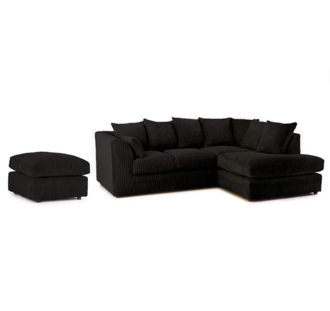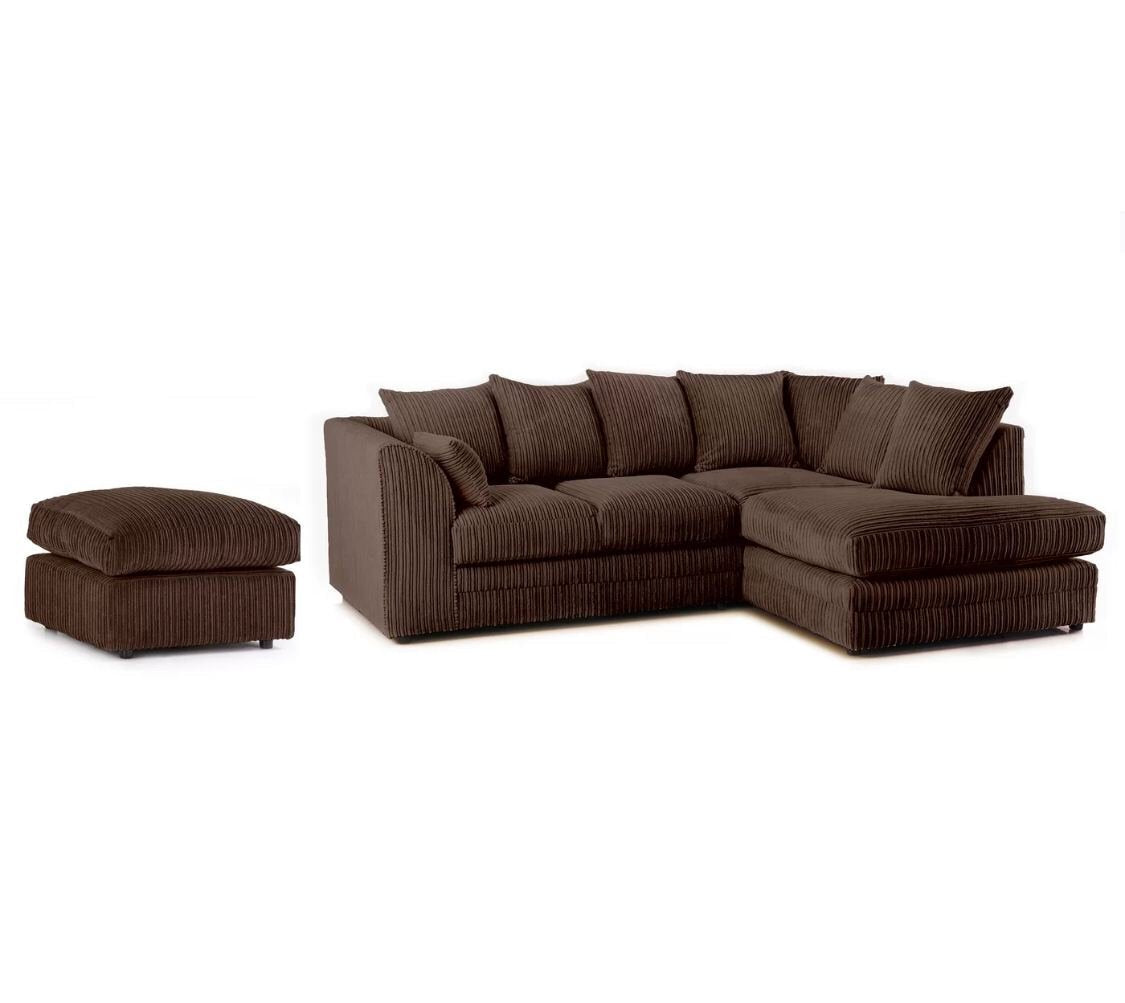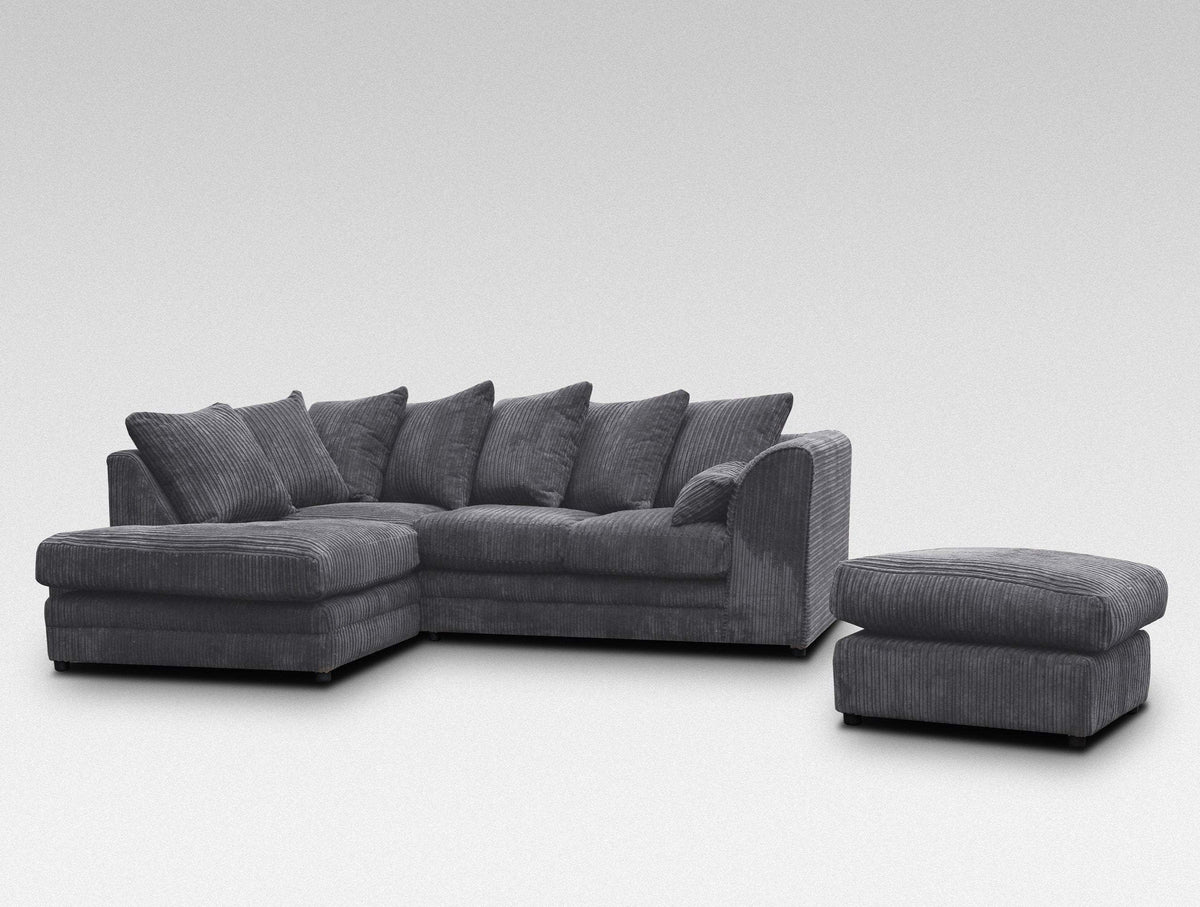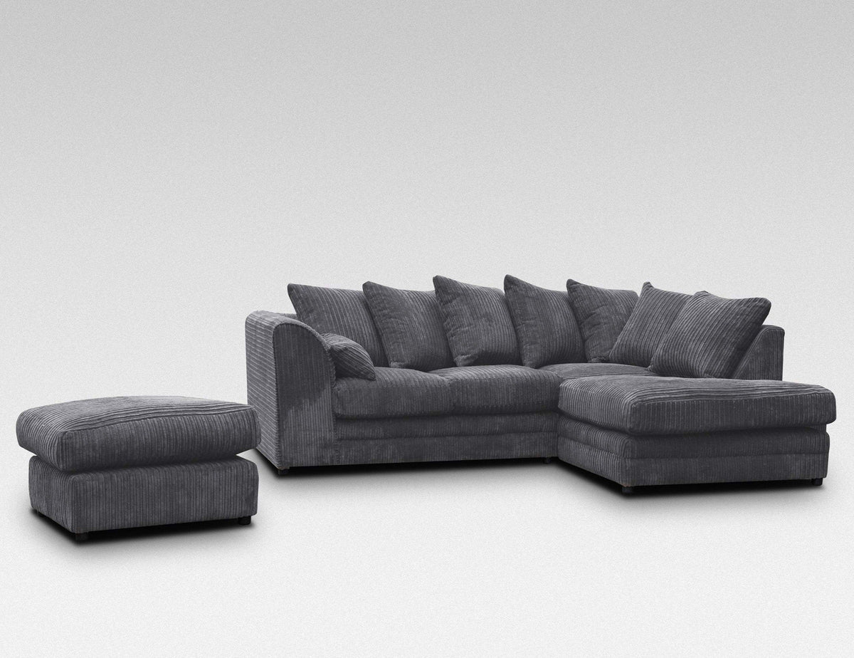 Desmond Jumbo Cord Corner Sofa is Hard-wearing and soft corduroy upholstery plus footstool give this large corner sofa an inviting texture. Ideal for a busy living space, this sofa can seat up to four people and has a robust wooden construction with a plush foam filling. Scatter cushions enhance the comfort on offer, while web suspension gives this sofa the firm support it needs. Assembly is required- Only attaching the clips