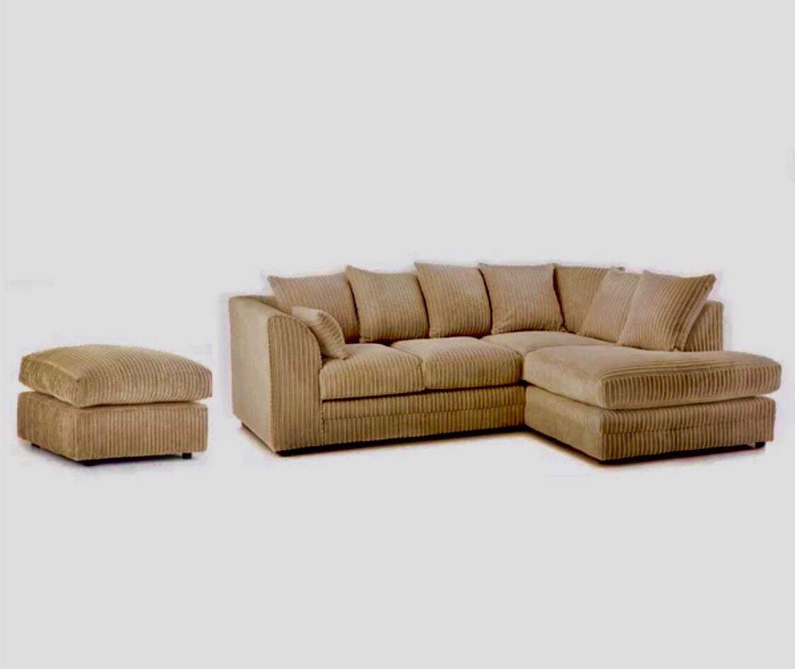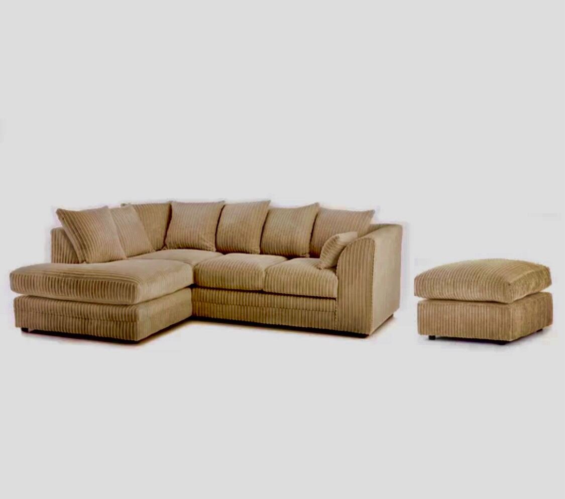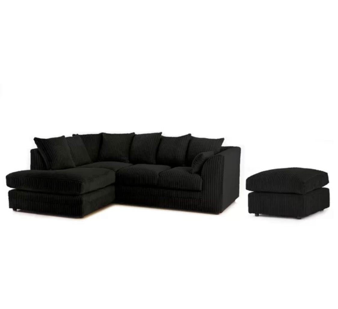 Desmond Jumbo Cord Corner Sofa is Hard-wearing and soft corduroy upholstery plus footstool give this large corner sofa an inviting texture. Ideal for a busy living space, this sofa can seat up to four people and has a robust wooden construction with a plush foam filling. Scatter cushions enhance the comfort on offer, while web suspension gives this sofa the firm support it needs. Assembly is required- Only attaching the clips