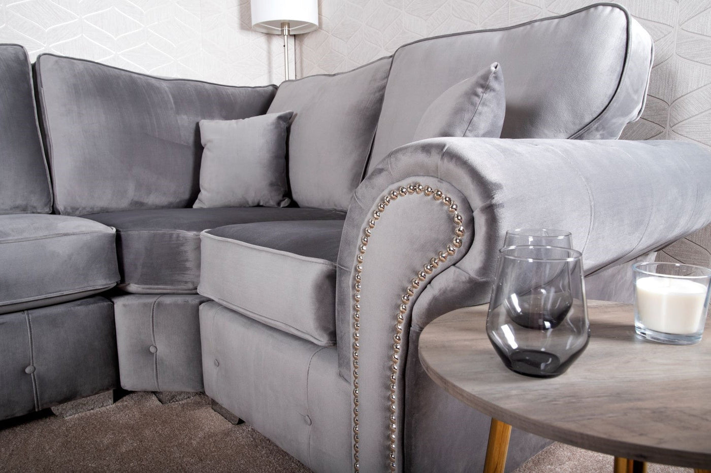 ‘Plush Grey’ fabric that maintains softness and appearance of velour creating an iconic look for any living space