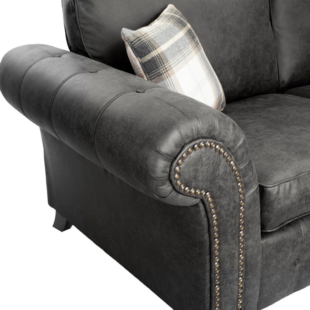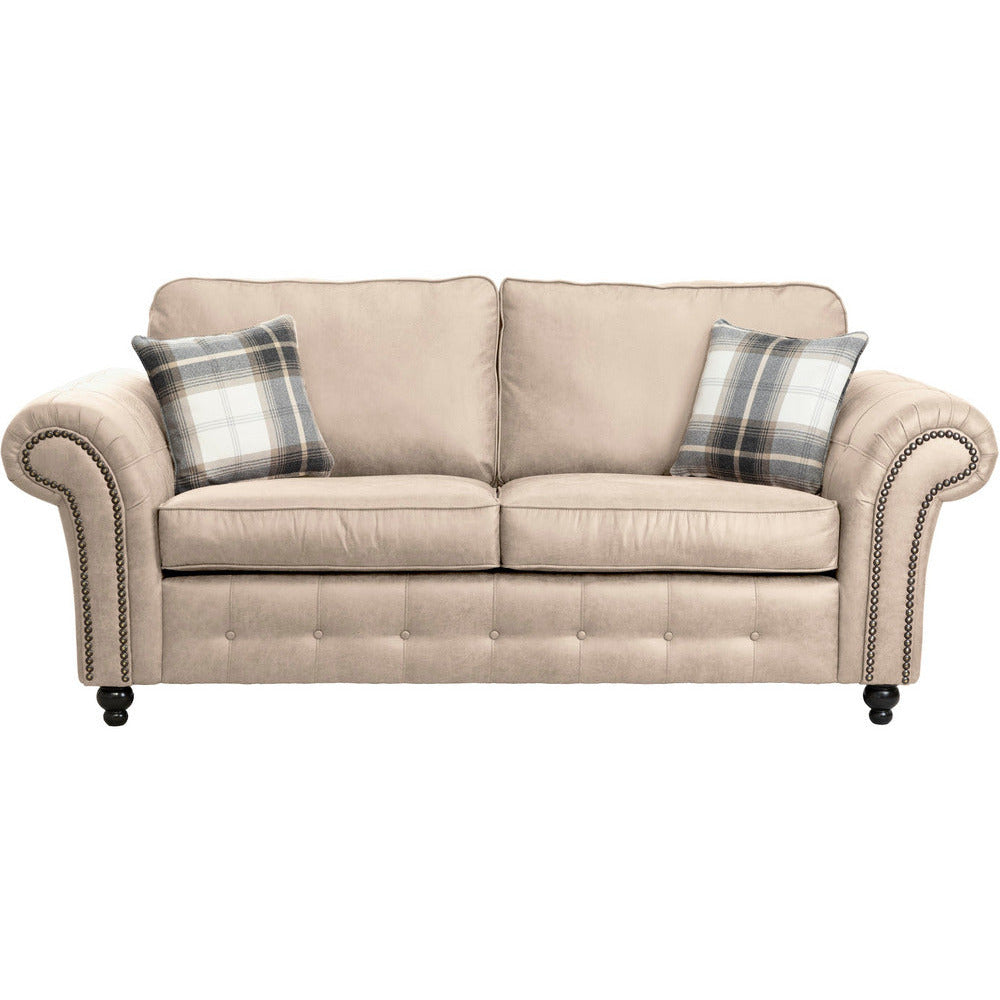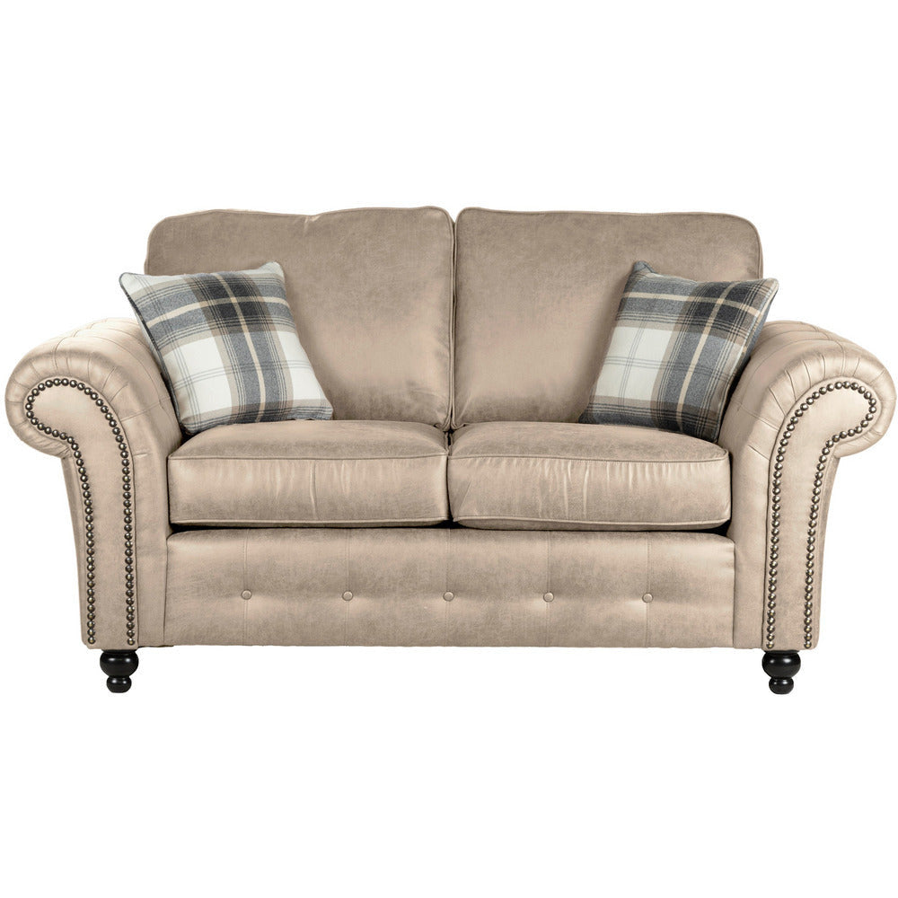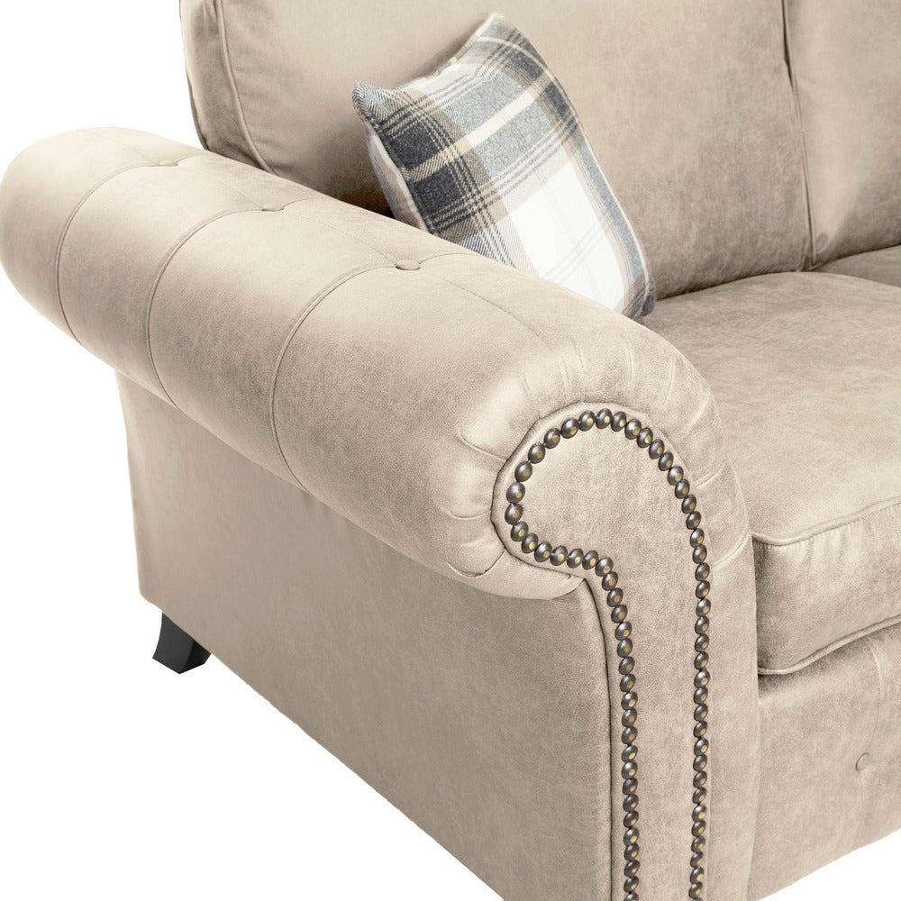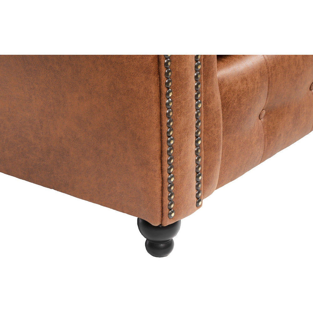 The Oakland is the perfect sofa collection those wanting to keep the traditional style with a vintage twist. Finished a soft touch faux leather upholstery and available in three stunning colours, tan brown, charcoal black & marble cream. Features include stylish brass studding work and button detailing with elegant wooden feet.