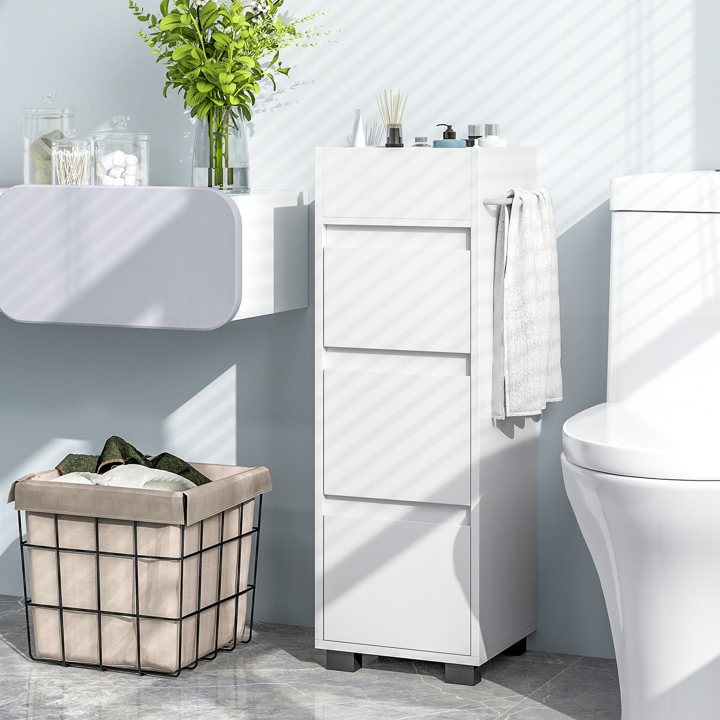 This freestanding storage organizer features a 4-way top divider, 3 drawers, and a practical towel rack, offering ample storage space and efficient organization. The top dividers are suitable for frequently used items, while the drawers keep your bathroom essentials secure from water exposure. The functional towel rack on the side can be mounted on either side according to your specific needs and preferences. Invest in this sturdy and functional bathroom floor cabinet to keep your space organized and clutter-free. If you are looking for a freestanding storage organizer like this, do not hesitate to place an order! Space-Saving Design: As a perfect storage solution for small spaces, this bathroom floor cabinet measuring 33.5 x 30 x 90 cm (L x W x H) can help you utilize every corner in the room and improve your space-efficiency. Ample Storage Space: Featuring a 4-way top divider, 3 drawers, and a convenient towel rack, this freestanding storage organizer is designed for efficient organization. The top dividers are ideal for often-used items while the drawers keep your bathroom essentials from water. Functional Towel Rack: The towel rack on the side keeps towels easily accessible, adding convenience to your bathroom storage. Besides, it can be mounted on either side according to your need. Sturdy Construction: Crafted with durable MDF material, this 3-drawer dresser is built to withstand daily use. The drawers are equipped with edge pull handles and metal drawer slides, which ensures easy opening and reliable durability. Easy Maintenance: Crafted with a smooth and waterproof surface, you are able to enjoy quick and hassle-free cleaning with a damp cloth. Plus, the elevated bottom keeps the storage cabinet from water.