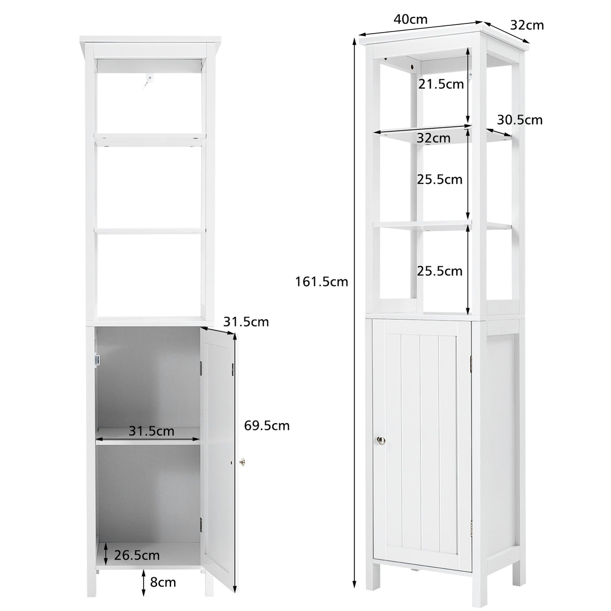 Colour: White Material: MDF Product Dimensions: 40cm x 32cm x 161.5cm (LxWxH) Load Capacity: 18 lbs (Each Tier); 10kg (Bottom Part) Net Weight: 17kg Box Qty:1(May vary by batch)Package includes: 1 x Freestanding Bathroom Cabinet 1 x Instruction Instruction