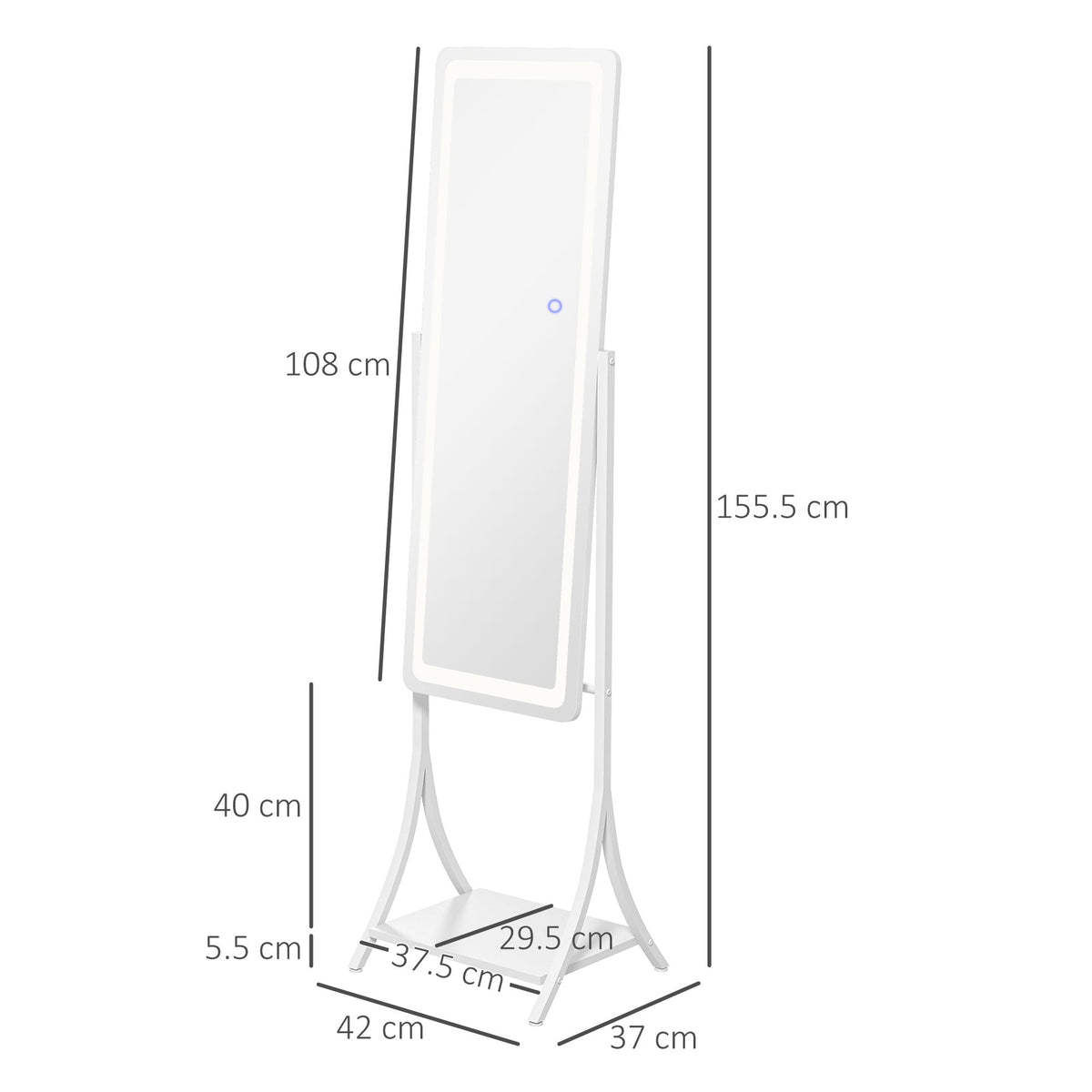 HOMCOM Free Standing Dressing Mirror with LED Lights, Full Length Mirror with 3 Temperature Colours and Storage Shelf - White