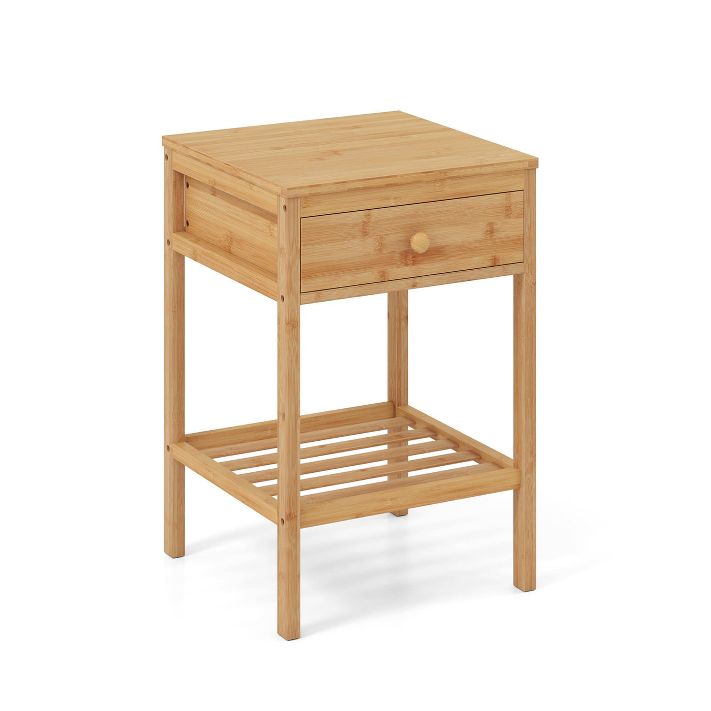 Colour: Natural Material: Bamboo, MDF Overall Dimensions: 40 x 40 x 61 cm (L x W x H) Inside Dimensions of Drawer: 33 x 34 x 10 cm (W x D x H) Dimensions of Slatted Shelf: 35 x 35 x 27 cm (L x W x H) Off-Ground Clearance: 14 cm Weight Capacity of Tabletop: 30 kg Weight Capacity of Drawer: 5 kg Weight Capacity of Shelf: 5 kg Net Weight: 5.5 kg Box Qty: 1(May vary by batch) Package Includes: 1 x Nightstand 1 x Instruction Manual