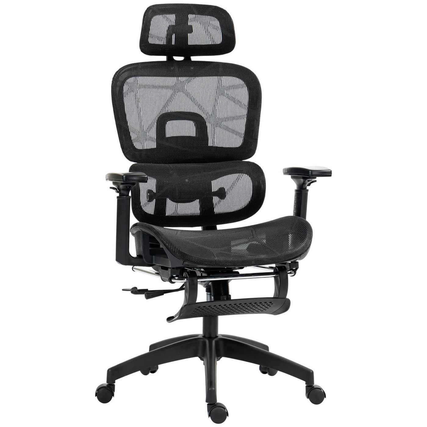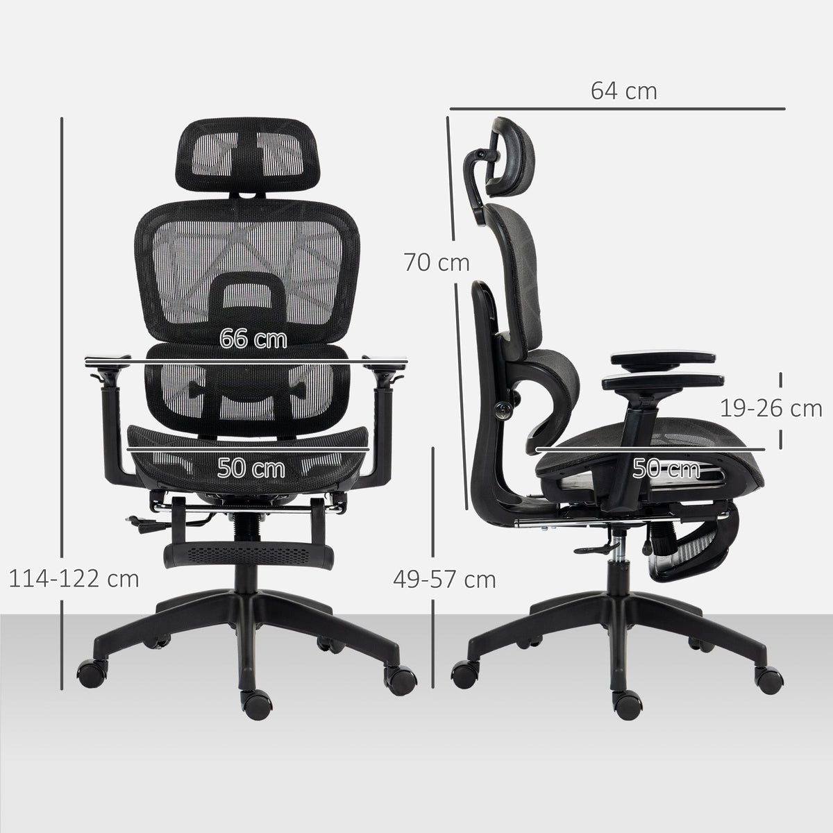 Support and comfort with this HOMCOM ergonomic office chair. The 135° reclining back, with three lockable positions, is paired with the manuel footrest to elevate your lower body. Enjoy the flexibility of the adjustable headrest, 3D armrest that adjusts up/down, forward/backward and left/right, adjustable lumbar support, 114-122cm seat height and depth adjustment. Complete with five wheels to move it around easily.
