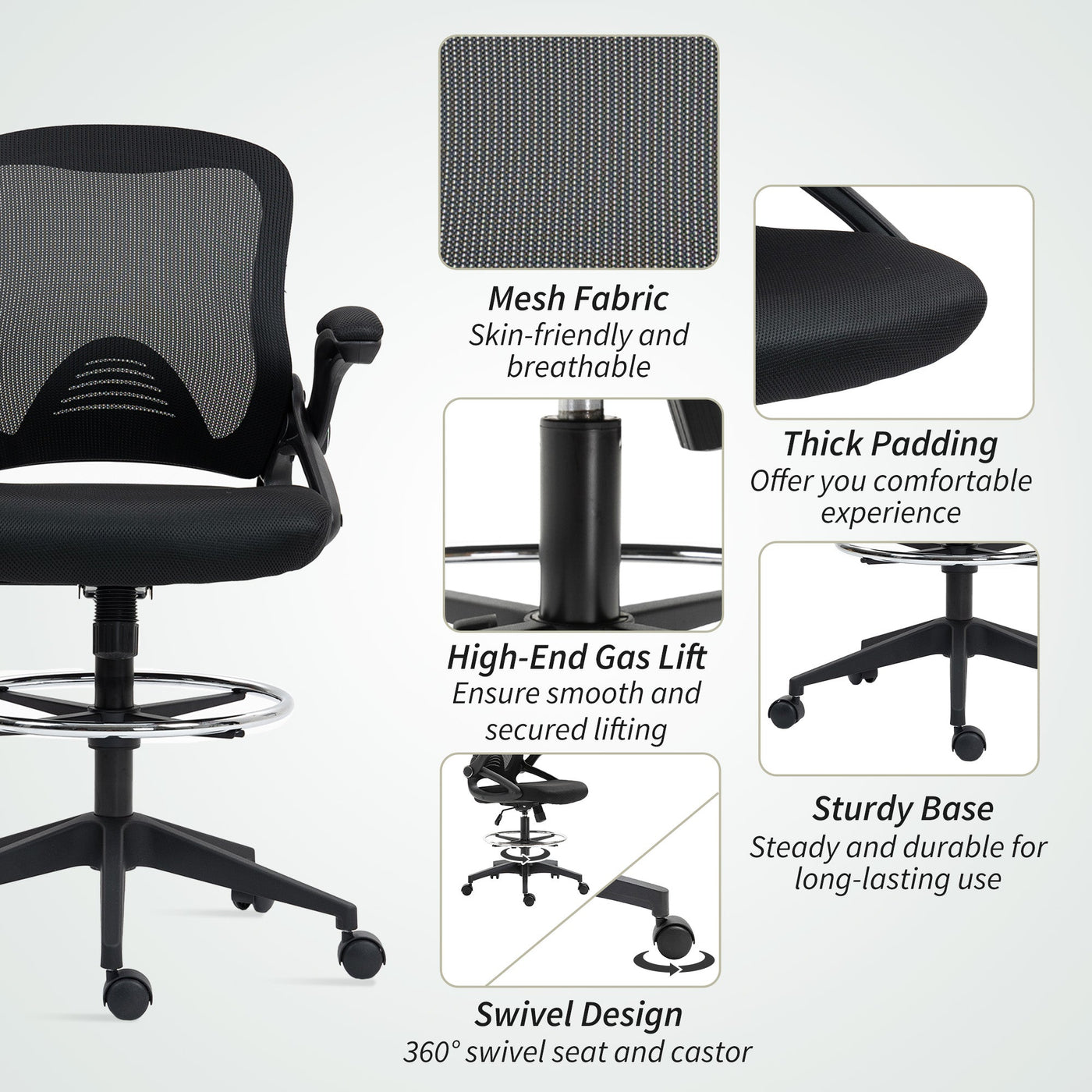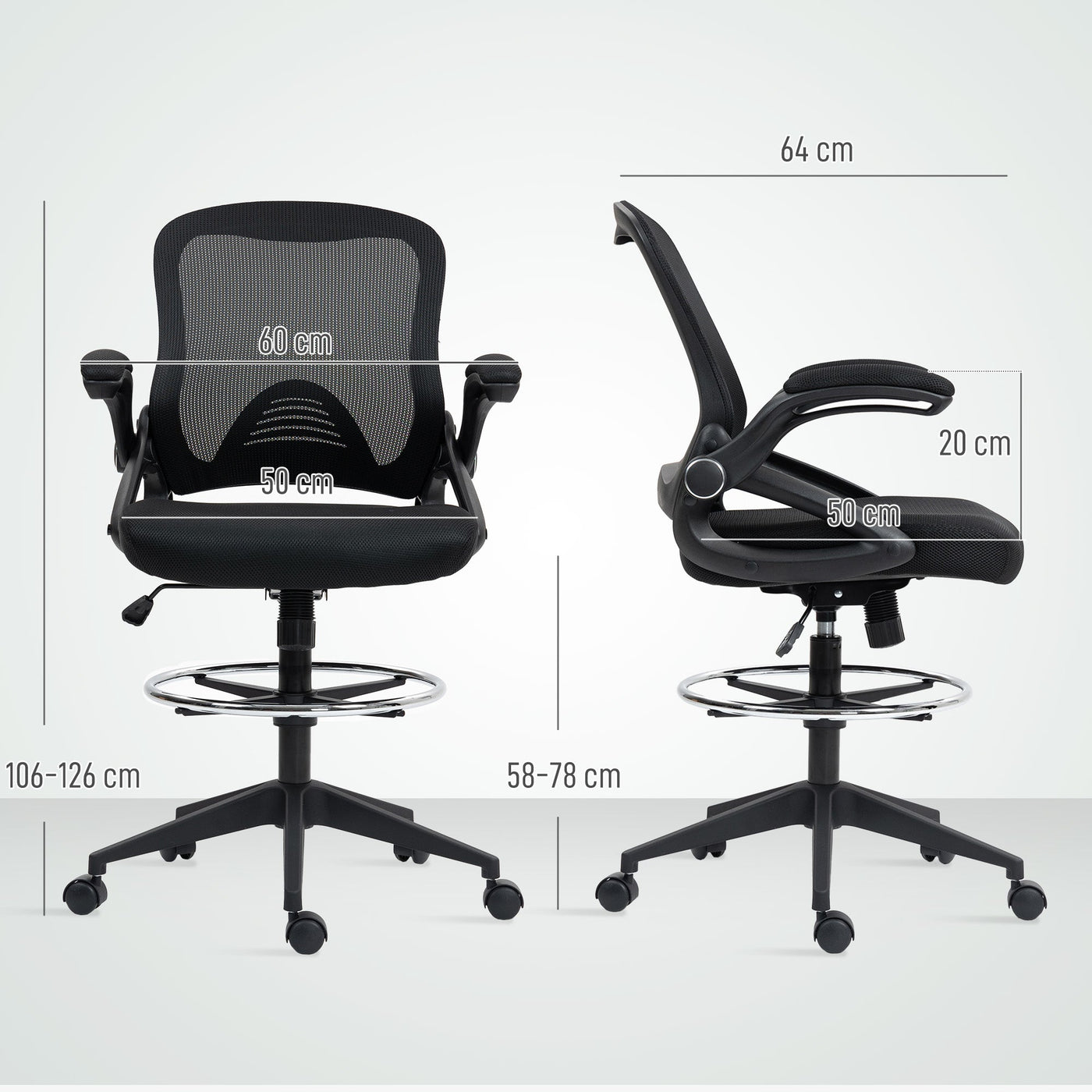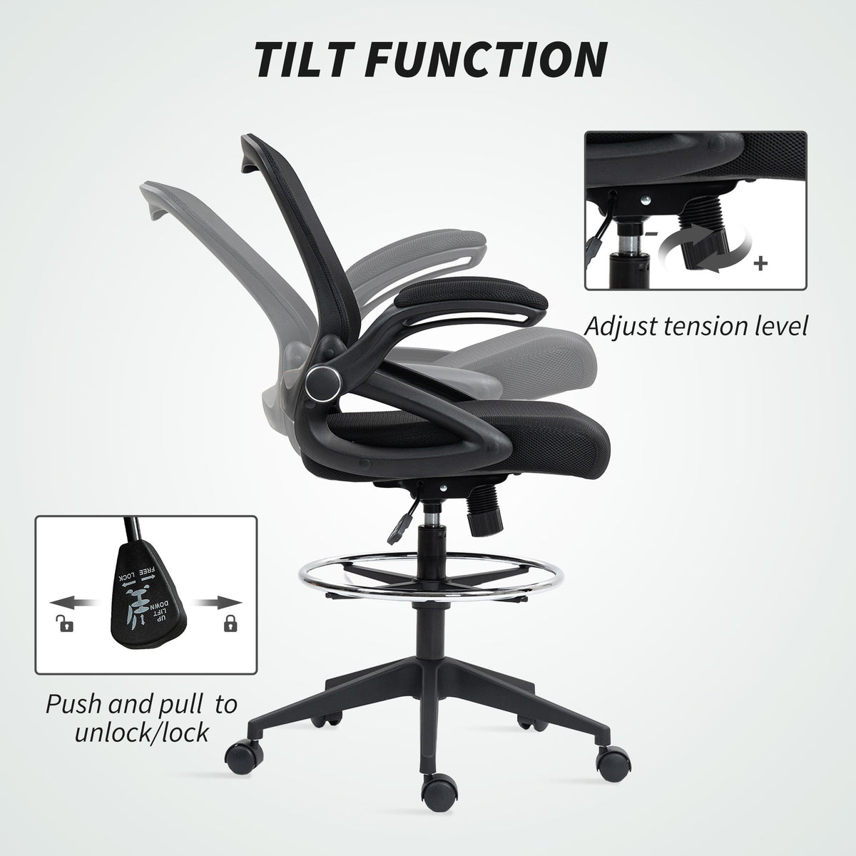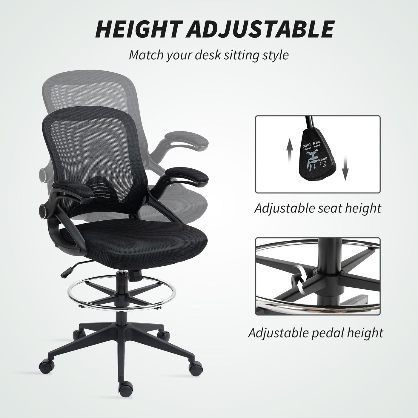 Vinsetto Drafting Chair with Flip-up Armrest, Mesh Office Stool with Foot Ring, 360 Degree Swivel Height Adjustable Chair for Standing Desk, Black - Black