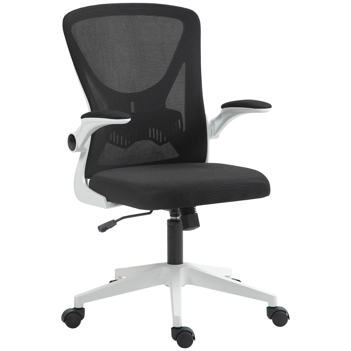 Comfort and functionality comes natural to this Vinsetto desk chair. It's designed to enhance your work experience daily: a curved back to support you, with mesh for ventilation. Flip-up armrests allow the swivel chair to fit neatly under the desk. 98-108cm height range to sit at a level you want. Complete with wheels to move around easily.