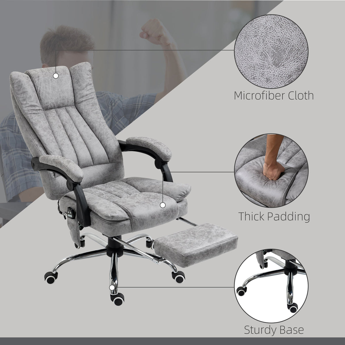 Vinsetto Office Chair with Massage and Heat, Microfibre Reclining Computer Desk Chair with Footrest and Adjustable Height, Swivel Wheels for Home Office, Grey - Grey
