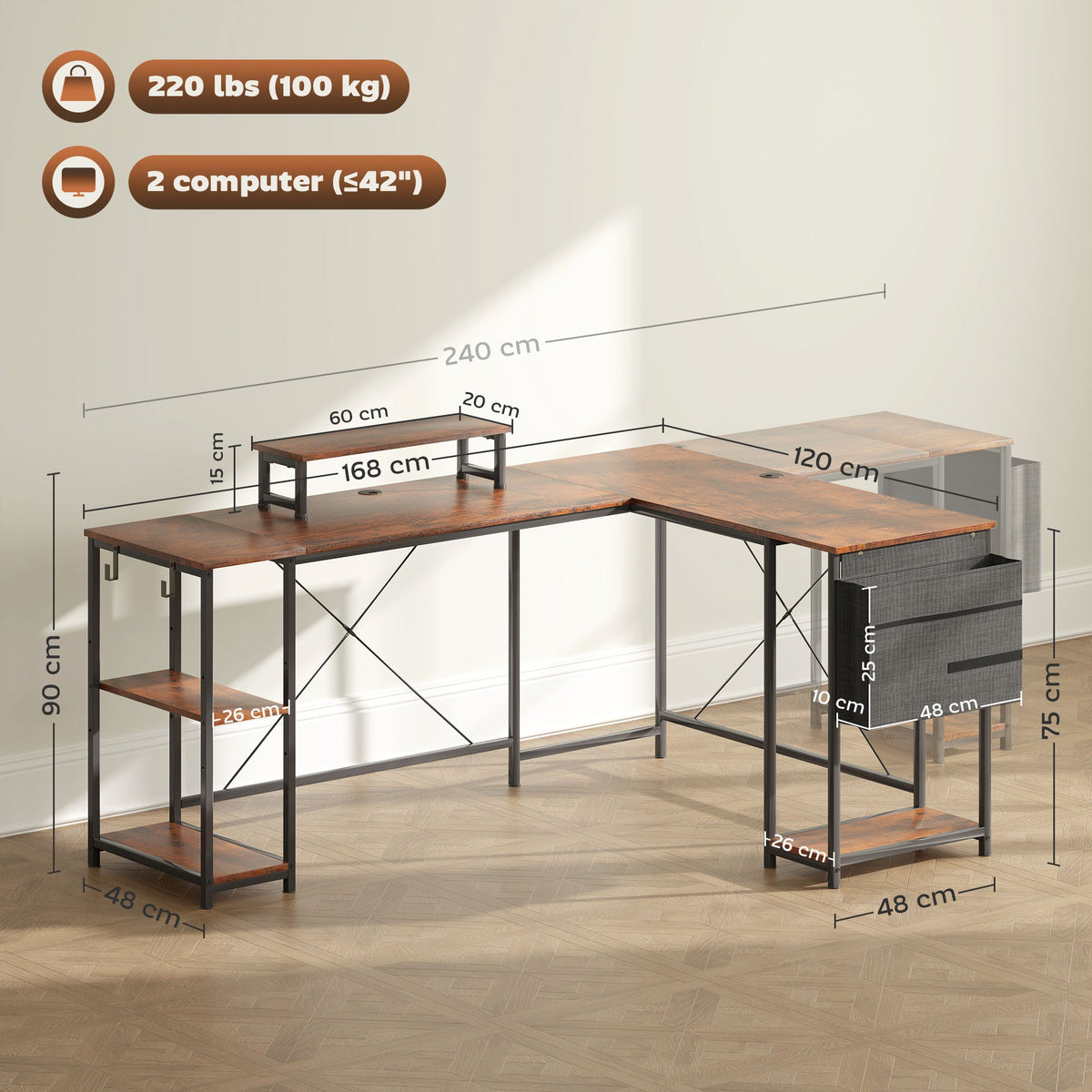 HOMCOM 168cm Reversible L Shaped Desk, Industrial Corner Computer Desk with Adjustable Shelf and Storage Bag, 240cm 2 Person PC Table with Monitor Stand, Rustic Brown - Rustic Brown