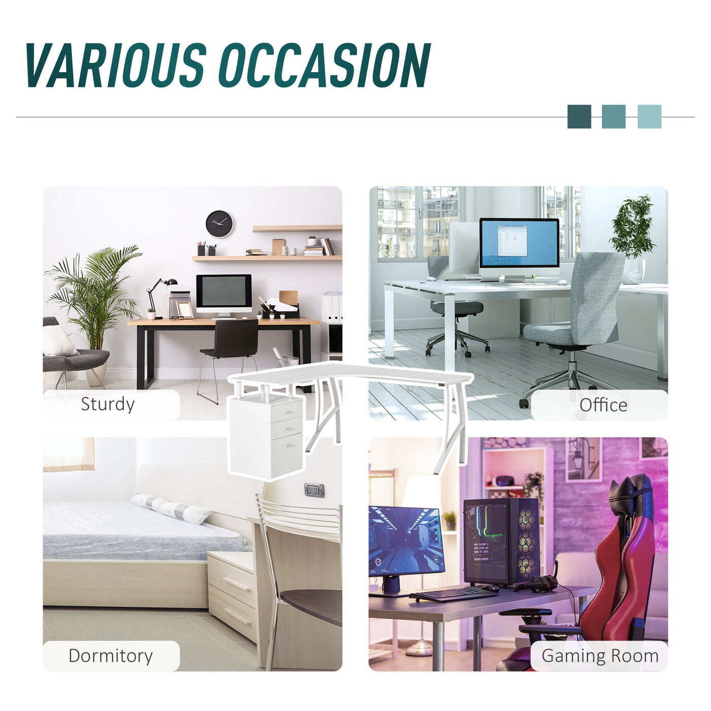 Modern and sleek, this work desk from HOMCOM looks as good as it feels when working, supporting you properly when you need to focus hard. Its 'L' shaped design fits perfectly into corners to help utilise space more efficiently. The frame is made from steel frame for a tough structure, fitted with MDF shelves so you can work well. There's plenty of space to work and have your computer and other devices on top. It's finished with a three-drawer cabinet so you can keep papers and more safely stored.