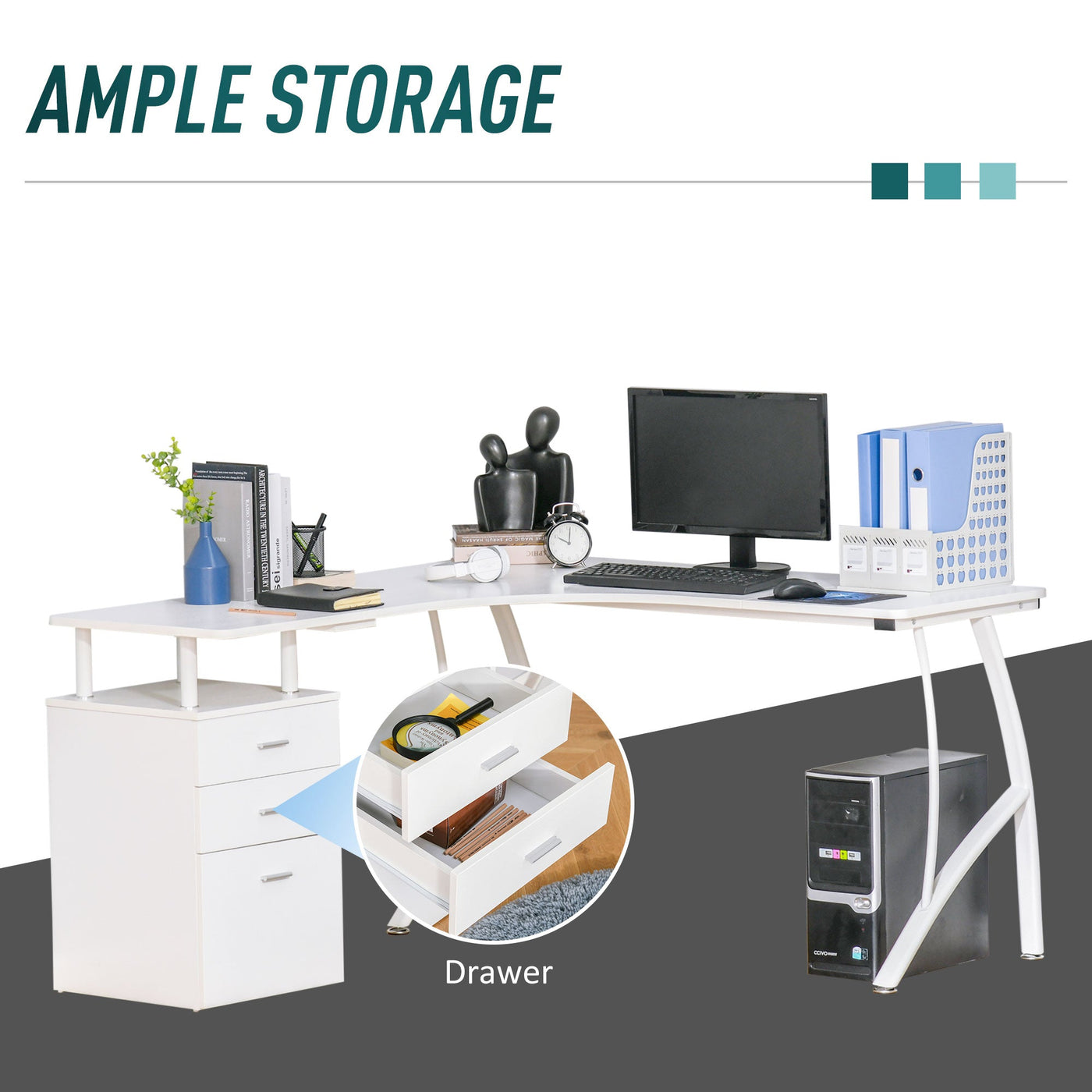 HOMCOM L-Shaped Computer Desk Table with Storage Drawer, Home Office Desk Corner Industrial Style Workstation for A4 Files 143.5 x 143.5 x 76cm, White - White