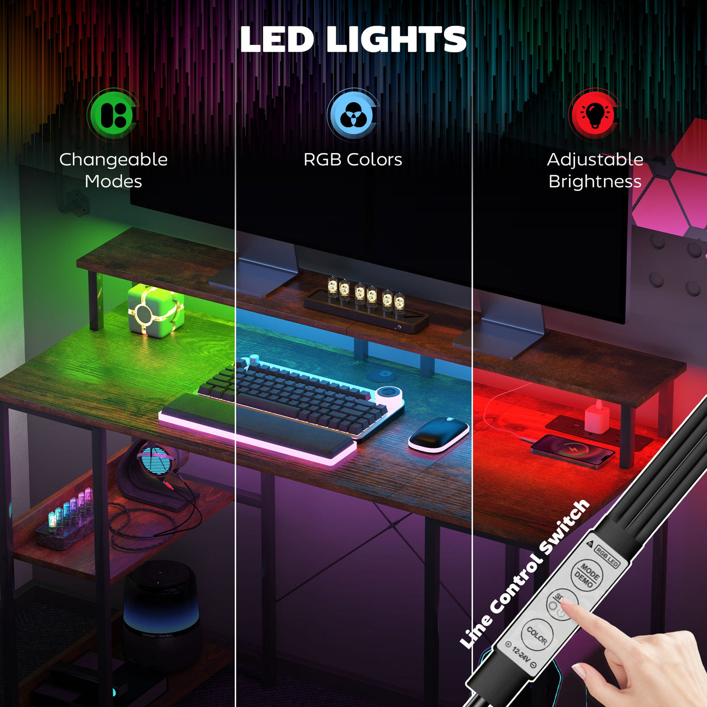 The HOMCOM computer desk offers plenty - the charging station has two UK plug sockets, a USB port and a USB-C socket for keeping electricals powered next to you as you work. With a large desktop to work, the writing desk also has an upper shelf for holding a screen at eye level to reduce neck strain. The RGB lights, with adjustable colours, brightness and modes, allow you to create the ambience you desire.