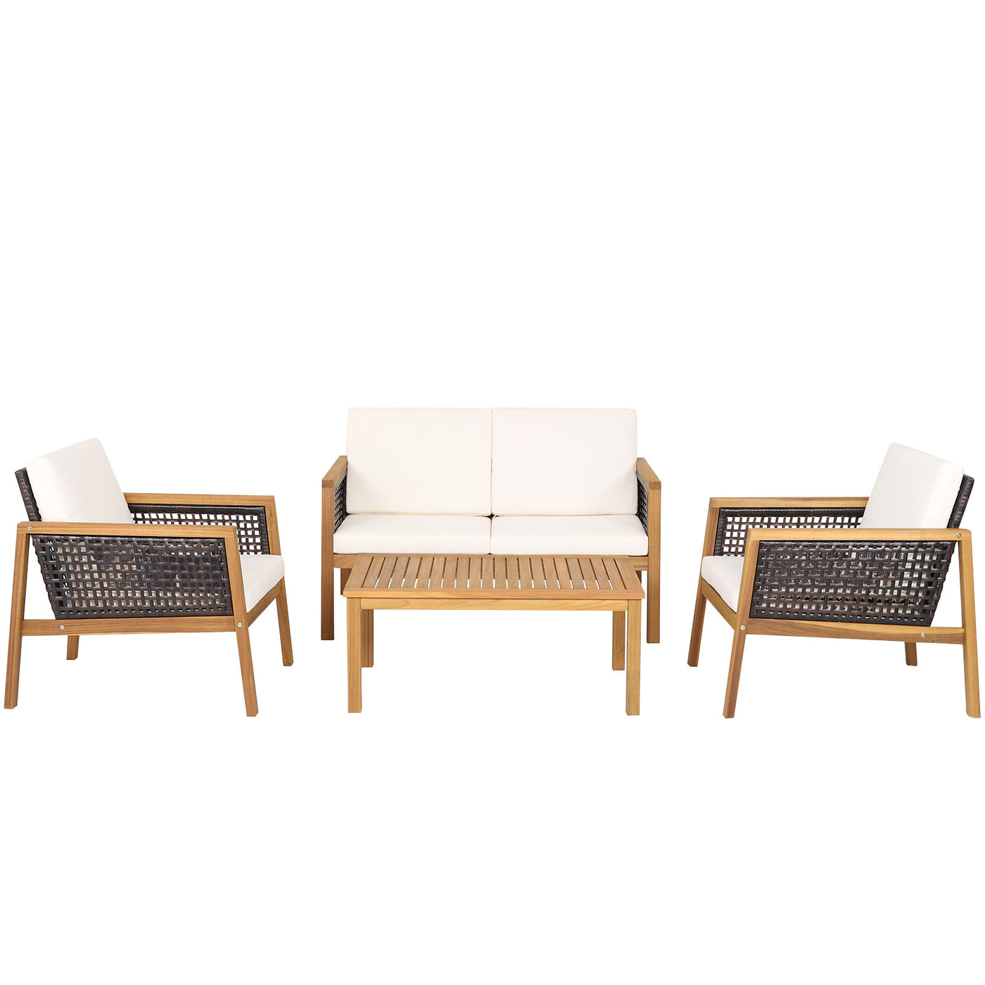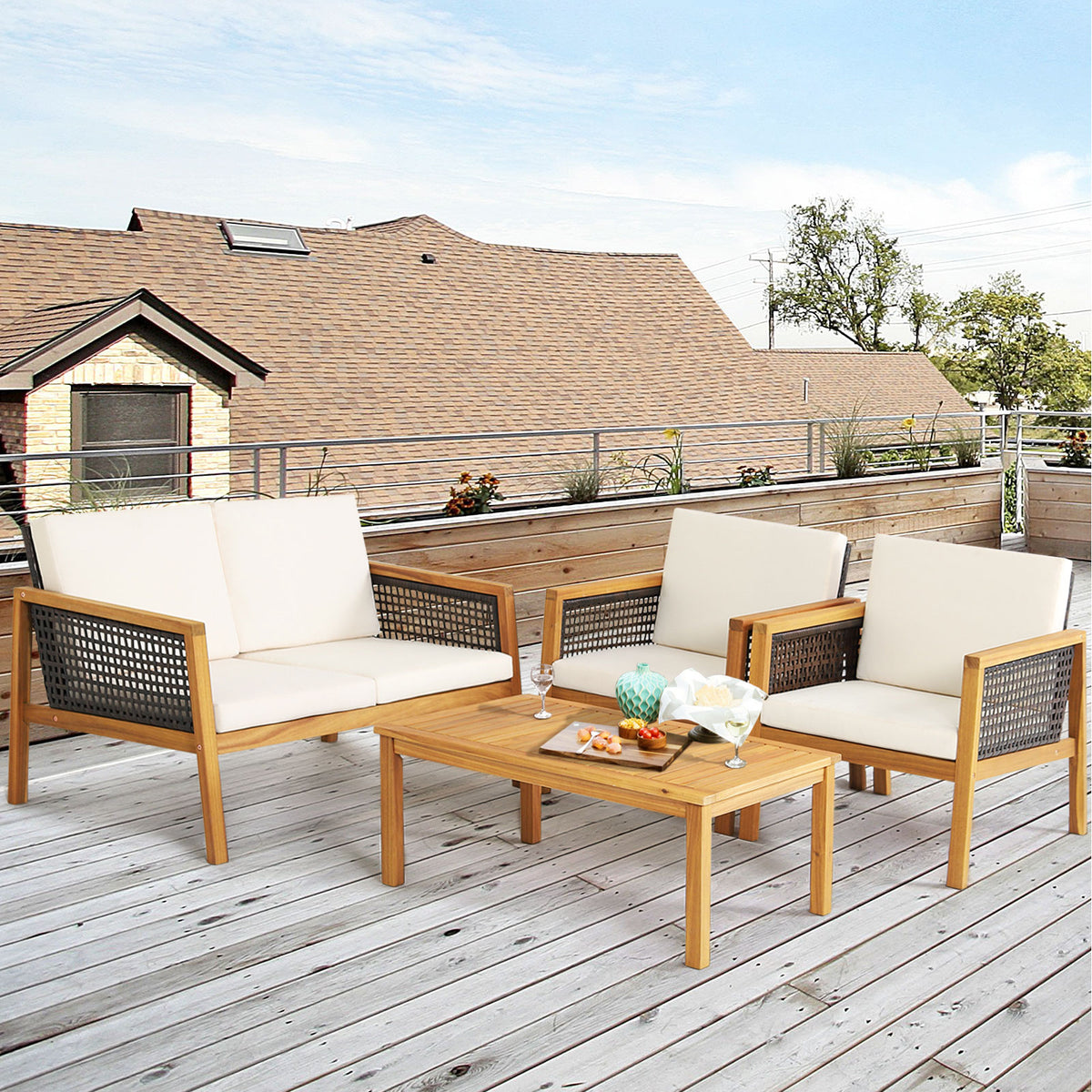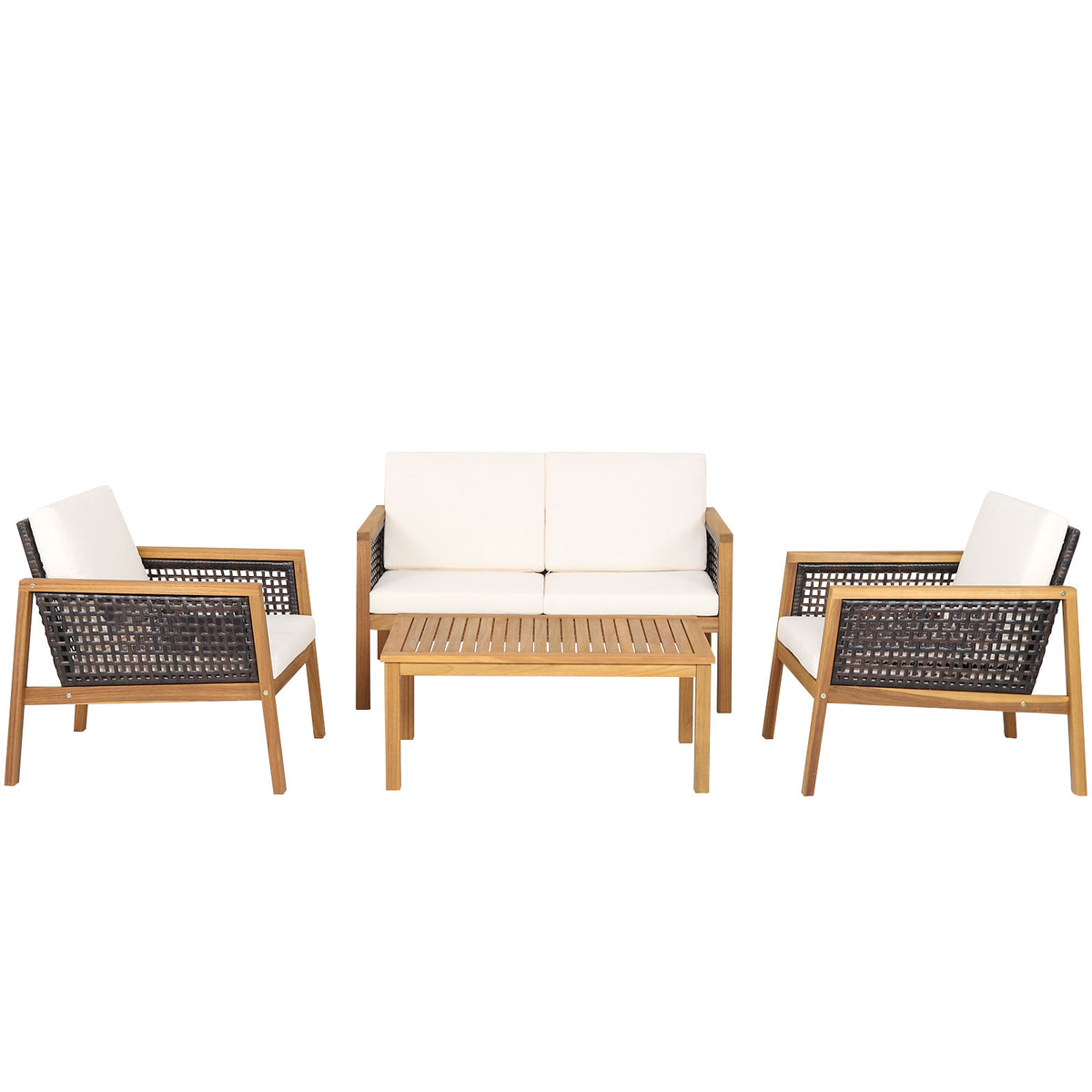 4-Piece Patio Acacia Wood Furniture Set with Removable Cushions-White