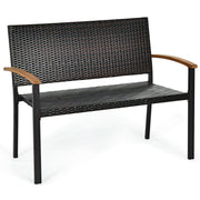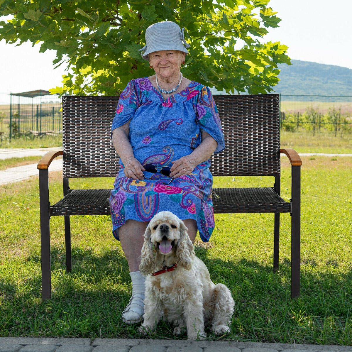 ‚óè Durable PE Rattan with Steel Frame: Wrapped with hand-woven PE rattan, our patio bench is weather-resistant enough for outdoor use. Strong steel frame ensures good rust resistance and durability. It is worth mentioning that the armrests on both sides are made of natural acacia wood for a long service time. ‚óè Great Conversation Piece: This garden bench is equipped with roomy seat space of 114cm in length and strong bearing capacity of up to 360kg, allowing 2 to 3 adults to sit together for better conversation. With dense but breathable rattan surface, this wicker bench is comfortable to touch even on hot summer days. ‚óè Cosy Sitting Experience: Built with curved arms and slightly inclined backrest, this outdoor bench provides optimal comfort for hours of relaxation. The radian of the seat and armrests can completely fit the body curve to enjoy when you lean on it. And the height of 45cm from the seat to the floor helps your legs fully relax. ‚óè Patio Furniture for Multiple Occasions: With rattan style and functional design, the park bench will add a touch of nature and elegance to your outdoor or indoor space. It is ideal for balcony, backyard, deck, garden, patio, etc., which can allow you to enjoy coffee time or book time with your friends or family. ‚óè Easy to Assemble and Clean: Comes with all needed parts, and the simply structured rattan bench is easy to assemble. You can put them together following the instructions step by step. In addition, the waterproof surface is easy to keep clean with a damp cloth.