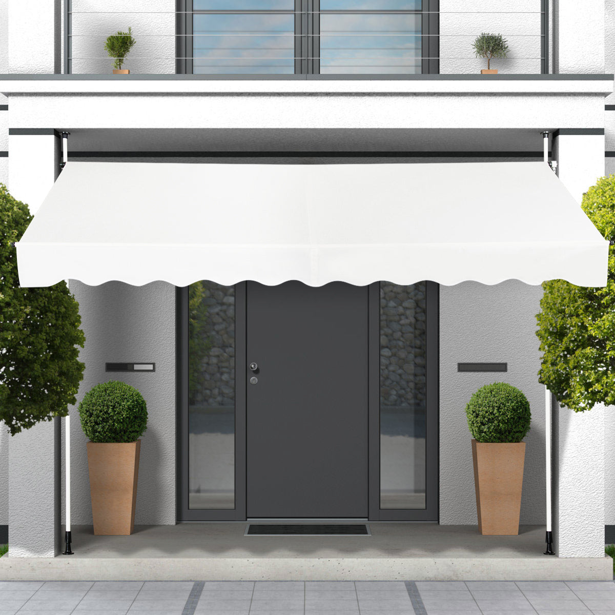 This retractable awning will be ideal for use in front of the window, on the terrace, balcony or in your garden. This weather resistant awning is made of well selected oxford fabric with PU coating. And featuring with lightweight design but solid aluminum frame, this sun shade has a stable and sturdy structure which can resist a certain scale of winds. Thanks to the handle crank, this awning is retractable and the height and the angle of the awning can also be adjusted. This smart design can reduce the harsh glare and provide you with softer light and cooler temperature. This awning is a perfect choice for your outdoor living space and can easily be operated manually. Well Selected Materials: Build with sturdy aluminum frame, our outdoor awning is durable enough to ensure a long period of life. Every part is connected tightly to form stable structure which provides strong support to resist a certain scale of wind. And with the premium Oxford fabric which is weather-resistant, this shade can resist fading, damp and dust. Heat and Light Insulation: The intense UV rays will not only dazzling you but also do harm to your eyes. Our balcony awning can effectively cut off the harsh glare and provide you with a soft light environment. And this sun shade can also reduce the heat caused by sunlight to keep your space much cooler. Adjustable Tube and Hand Crank: The height of the aluminum tube can be adjusted from 185cm to 305cm according to your actual needs with rotary knob at side. Coming with the manual crank, the angle of the awning can be telescoped according to your needs. No matter where the sun is, it can cover the sun well. Wide Range of Application: Coming with the modern design and classic color, the retractable awning can not only block out the hot sun but also is a nice decoration for your space. It is ideal for installing on windows, balcony, courtyard, patio, outdoor cafes and restaurants with back porches. Easy Assembly and Cleaning: The patio retractable canopy can be installed on a concrete, solid brick wall and even on a wooden wall. Clear instruction and hardware are included to make you easily assemble this canopy in a short time. Because of the waterproof design, this canopy is easy to clean with only a duster cloth.