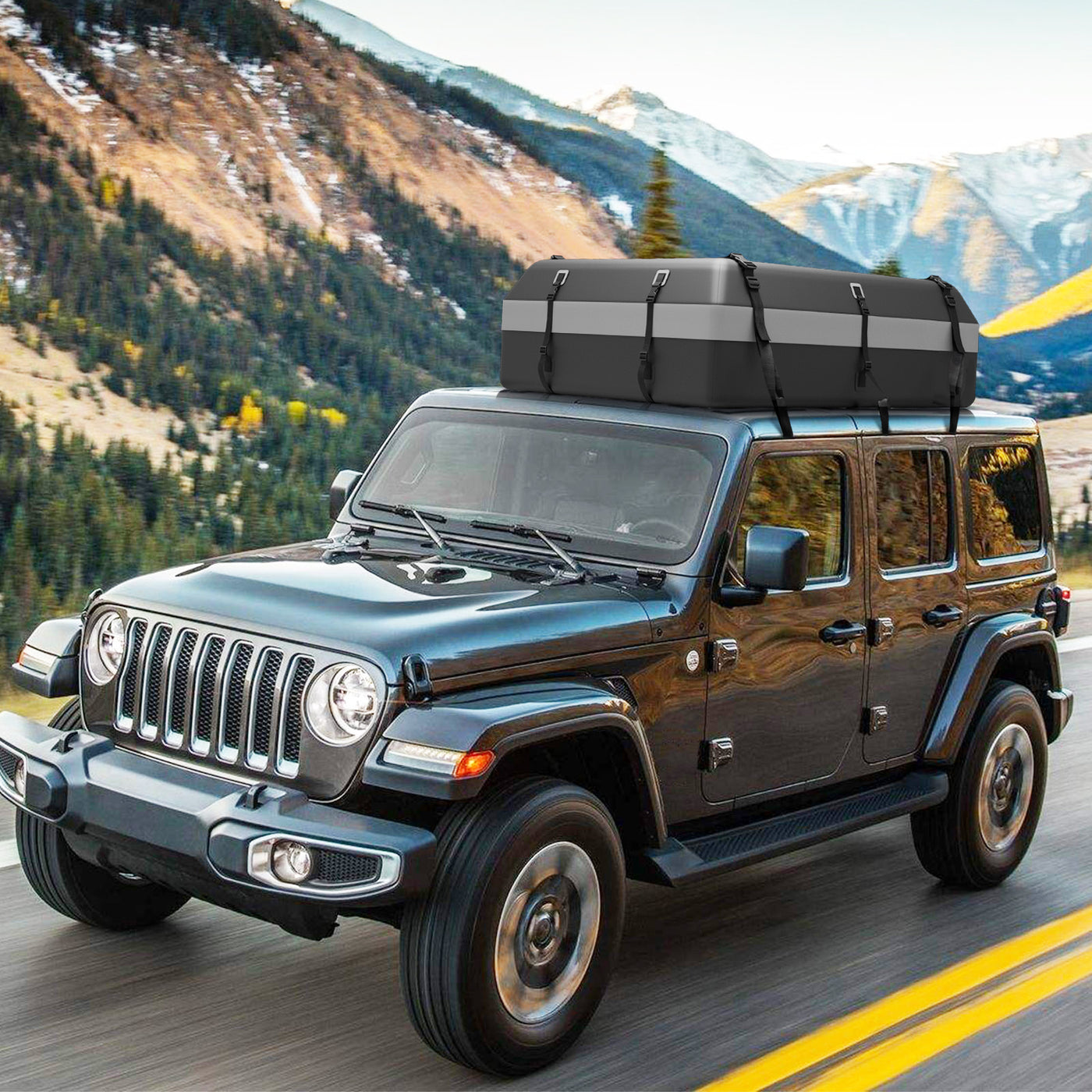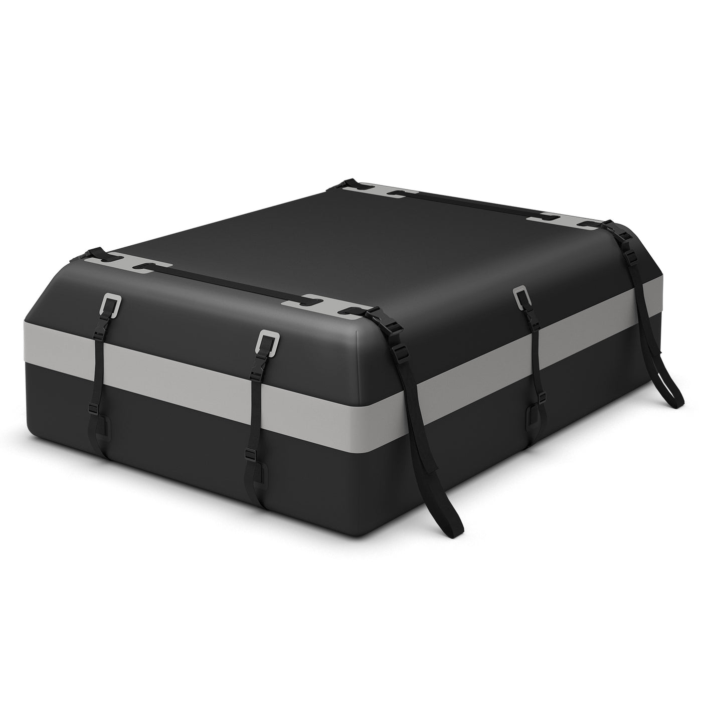 With a spacious 600L capacity, this car topper luggage carrier offers ample room to securely store your luggage, camping gear, sporting equipment and more. The bag is built with durable 840D PVC material, ensuring it can withstand the toughest weather conditions without tearing or ripping. Worried about rain ruining your belongings? Fear no more! This cargo bag features waterproof zippers and an extended rain curtain, fully protecting your valuables from water damage. What sets this rooftop cargo bag apart from the rest is its universal design. Compatible with all vehicles, whether they have a roof rack or not, this waterproof rooftop cargo carrier is incredibly versatile. It comes with 10 reinforced straps to ensure a secure and sturdy attachment to your vehicle's roof. For added stability, we've included an anti-slip mat that keeps the bag in place, preventing any unnecessary movement during your journey. Installing the cargo bag has never been easier! This package includes 6 door hooks that allow you to effortlessly attach the bag to your car's doors. Additionally, we provide a practical drawstring bag for convenient storage when the bag is not in use. Your security is this top priority. That's why this rooftop cargo carrier bag comes equipped with a luggage lock, ensuring that your belongings remain safe and protected throughout your trip. 100% Waterproof Material: In addition to the durability and tear resistance, the 840D PVC material also endows this rooftop cargo carrier with waterproof feature. Besides, the waterproof zippers are covered with an extended rain curtain to ensure extra protection for inner items. Reliable and Safe to Use: After putting this car topper luggage carrier on the car roof, you can use 10 reinforced straps to fix it firmly. Then, this rooftop cargo bag will accompany you to go through different road conditions, such as bumping road, steep hill, sudden turn and high speed, etc. Roomy Storage Space: Designed with 600L inner capacity, this car top carrier accommodates 2 double tents, 3 medium suitcases and 6 sleep bags with ease, making more space in your car. And the luggage lock is included to prevent zippers from slipping while keeping luggage safe. Match with All Cars: Apart from 10 reinforced straps, this waterproof car topper luggage carrier also includes 6 door hooks, which means it works with all vehicles without racks, side rails, cross bars or basket/tray on the top. Therefore, you can it on your pickup, off-road vehicle, SUV or other cars. More Accessories: The anti-slip mat is also included in the package, which not only avoids scratching the rooftop but also ensures additional stability. If you do not need this car roof bag, just fold it and then put it in the drawstring bag for easy storage.